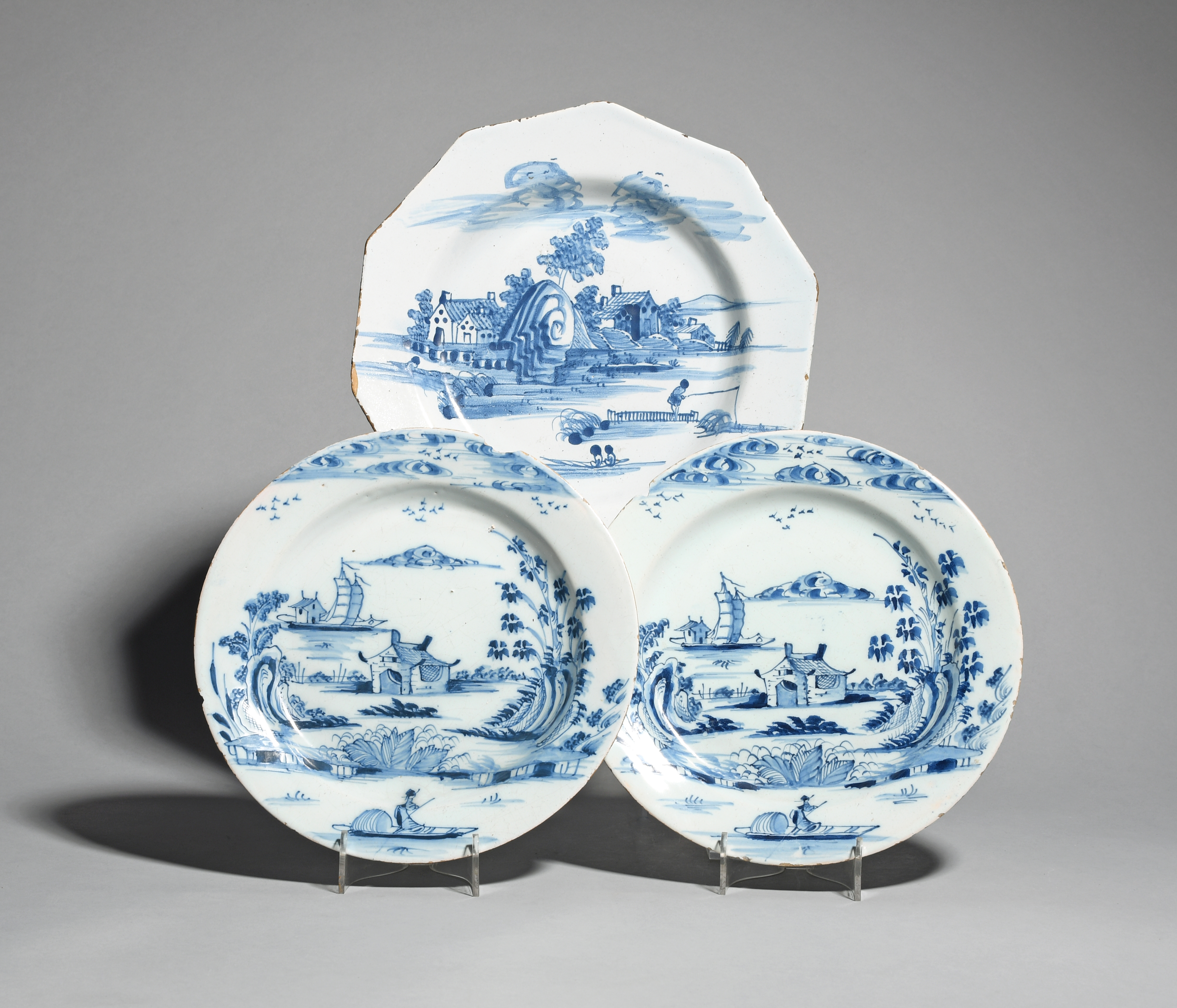 A pair of Bristol delftware plates mid 18th century, painted in blue with a figure in a boat before a low hut on an island, a further sailing boat in the background, and a large octagonal plate painted with a solitary figure fishing beside a low fence, before an island village scene, two dash marks on the reverse, some rim damages, 26.5cm max. (3)