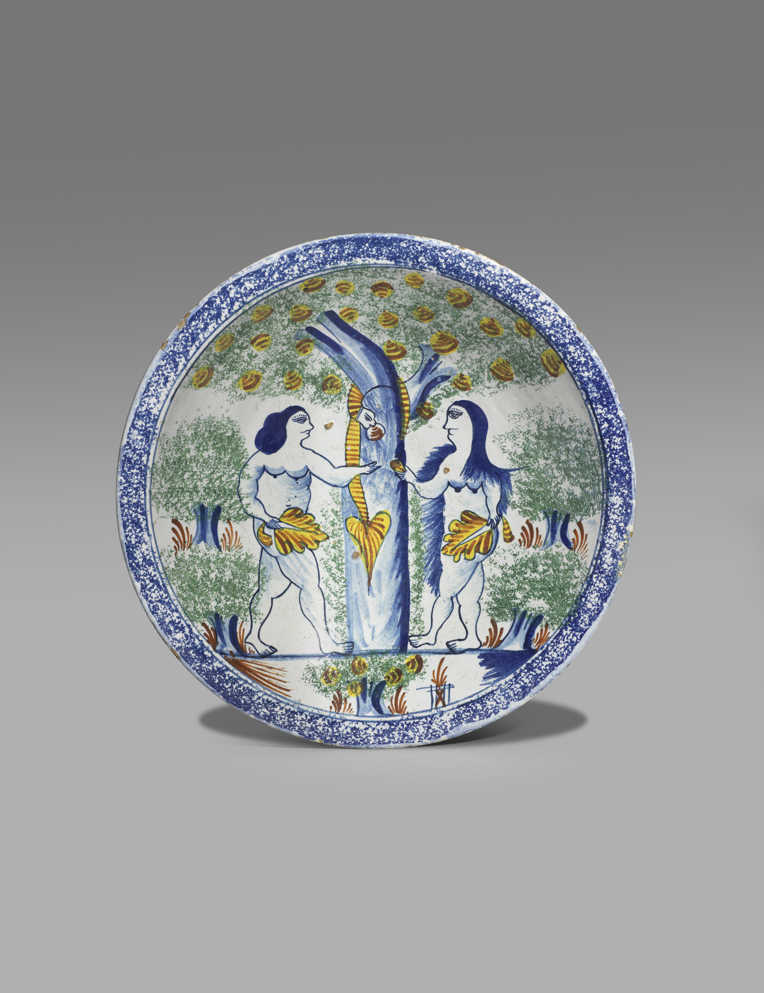 A Bristol delftware Adam and Eve charger c.1730-40, painted with the scene of the Temptation, the doomed couple flanking the Tree of Knowledge with the serpent draped around its trunk, painted in blue with sponged green foliage and detailed in ochre and umber, within a sponged blue border, 33cm.