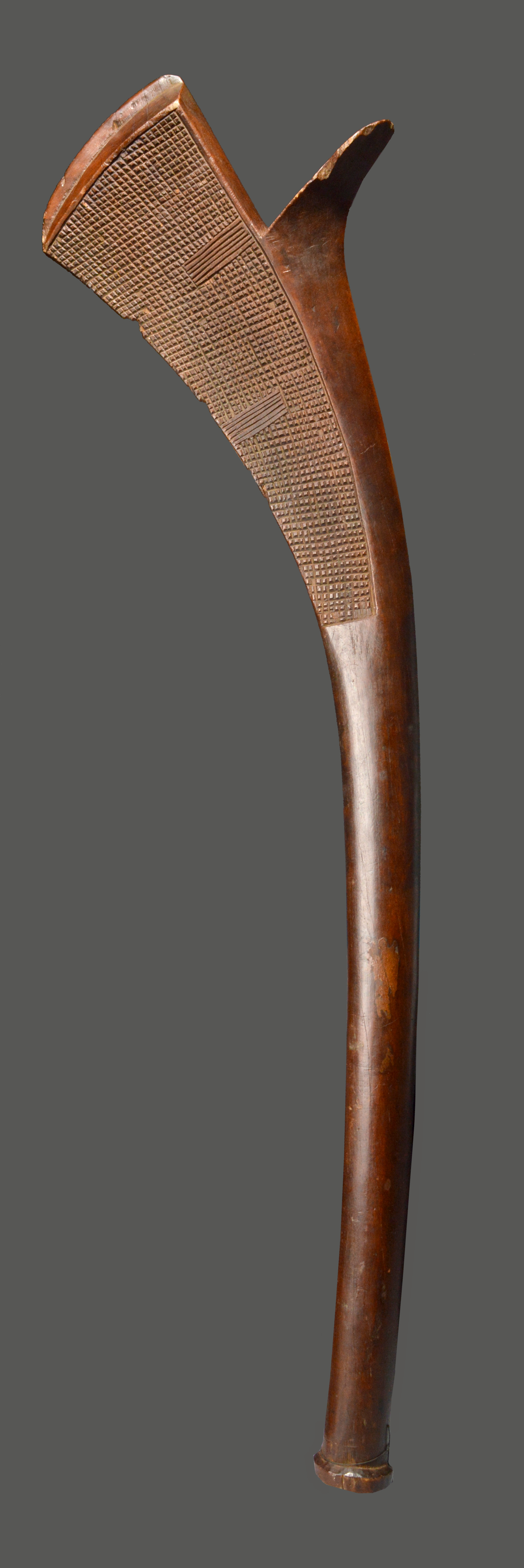 A Fiji club sali Melanesia the spurred and ridged curved blade with carved square and linear...