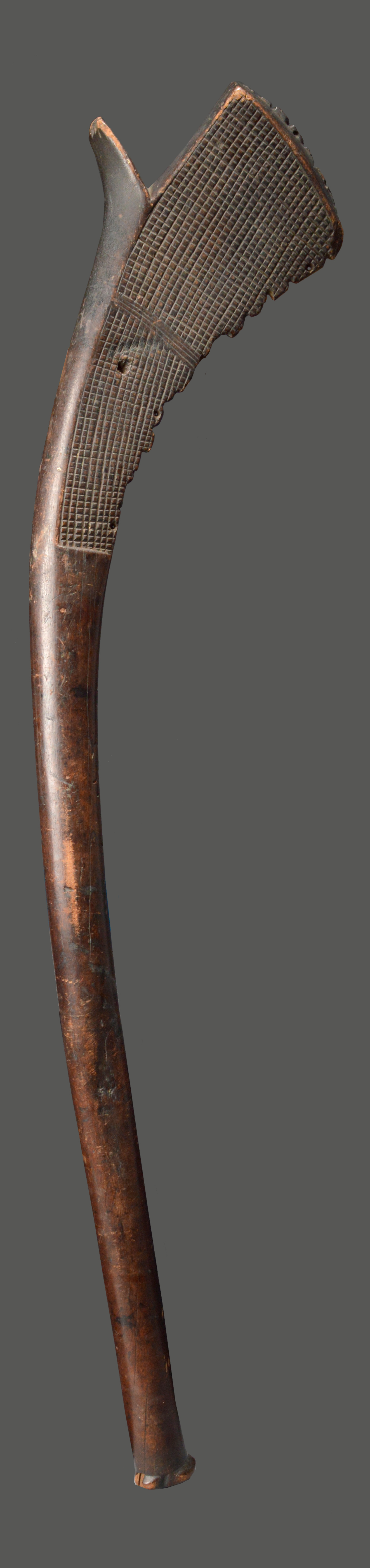 A Fiji club sali Melanesia the spurred curved blade with cut square decoration and remains of a...