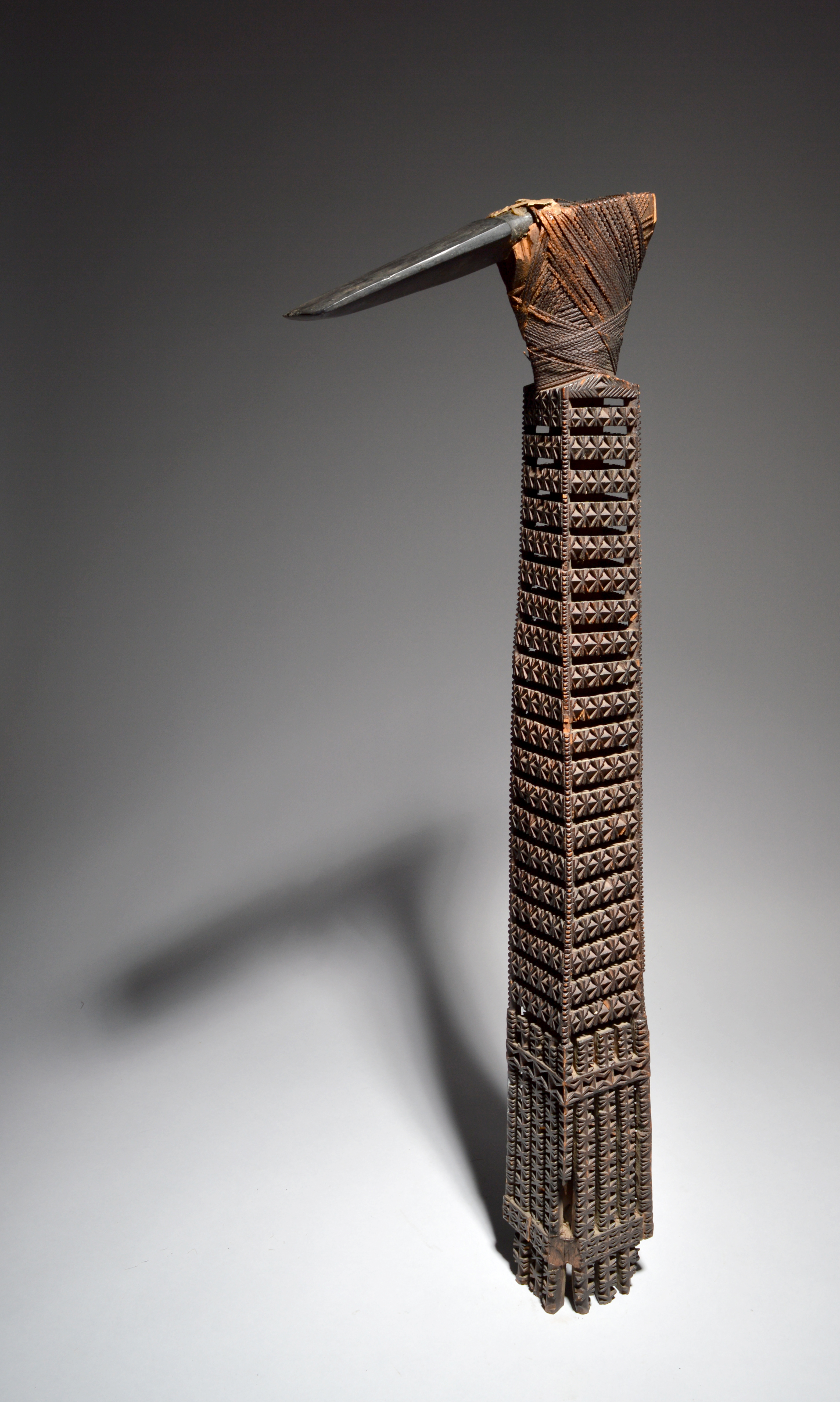with a faceted stone blade sennit bound to a carved square tapering column base with bands of lined X's,
