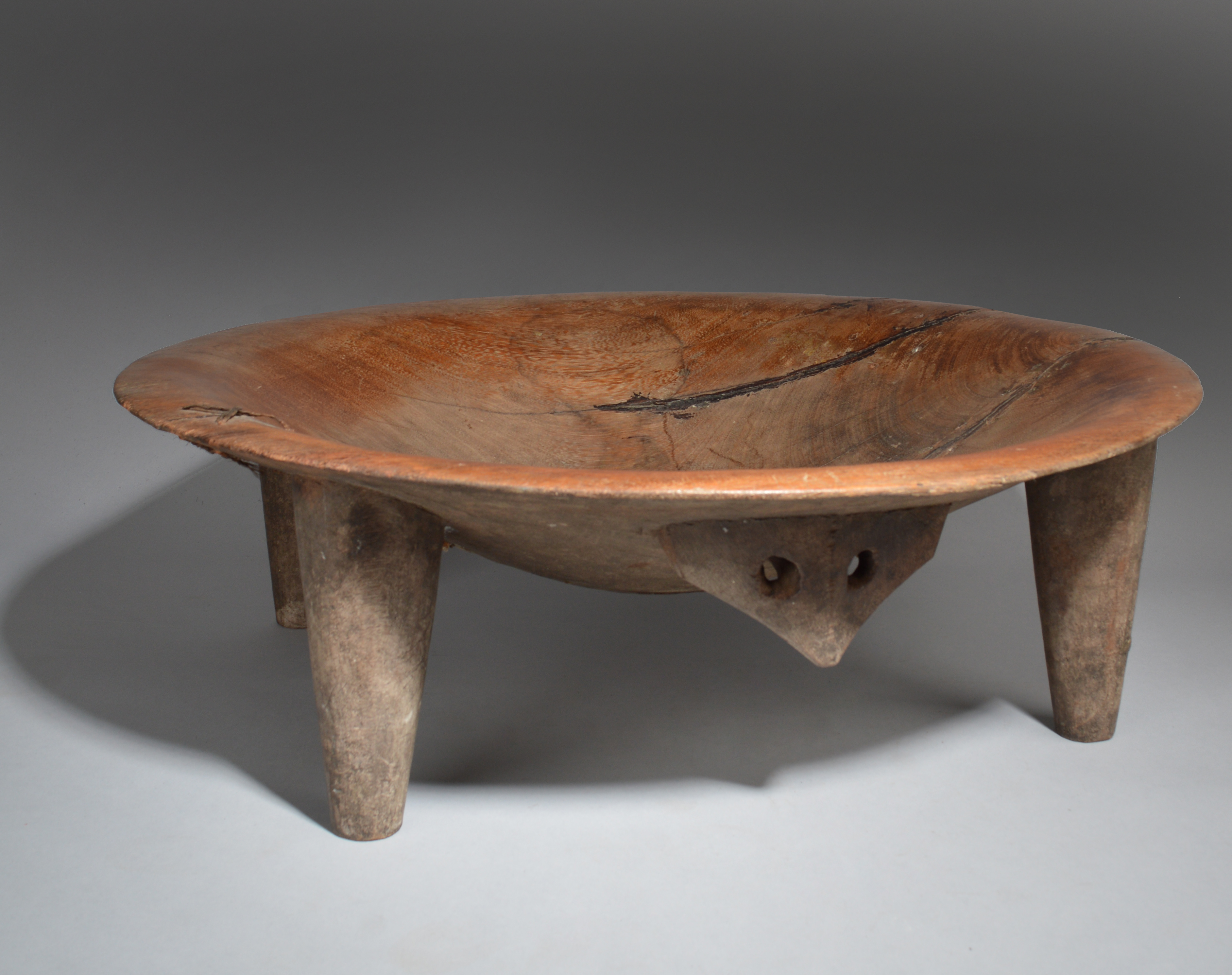 A Tonga kava bowl Polynesia on four tapering legs and with a pierced lug handle
