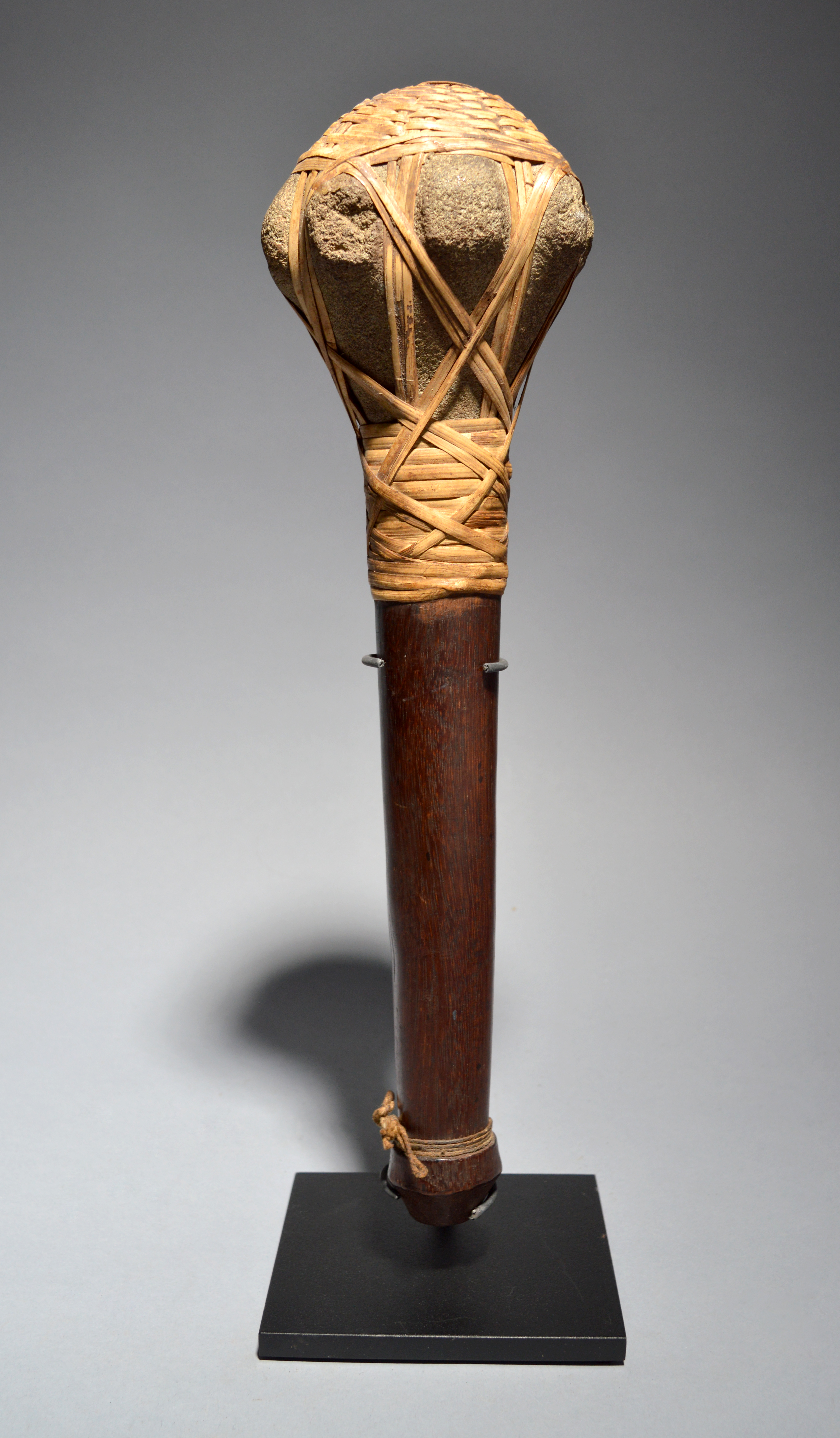 According to Kaeppler "This rare club has a finely shaped stone head. Most known examples are entirely made of wood. Only four other stone-head examples are known. These are in the Otago Museum, Dunedin, N.Z.; British Museum, London; Cambridge Museum of Archeology and Anthropology, U.K.; and Brisbane Museum, Australia."
