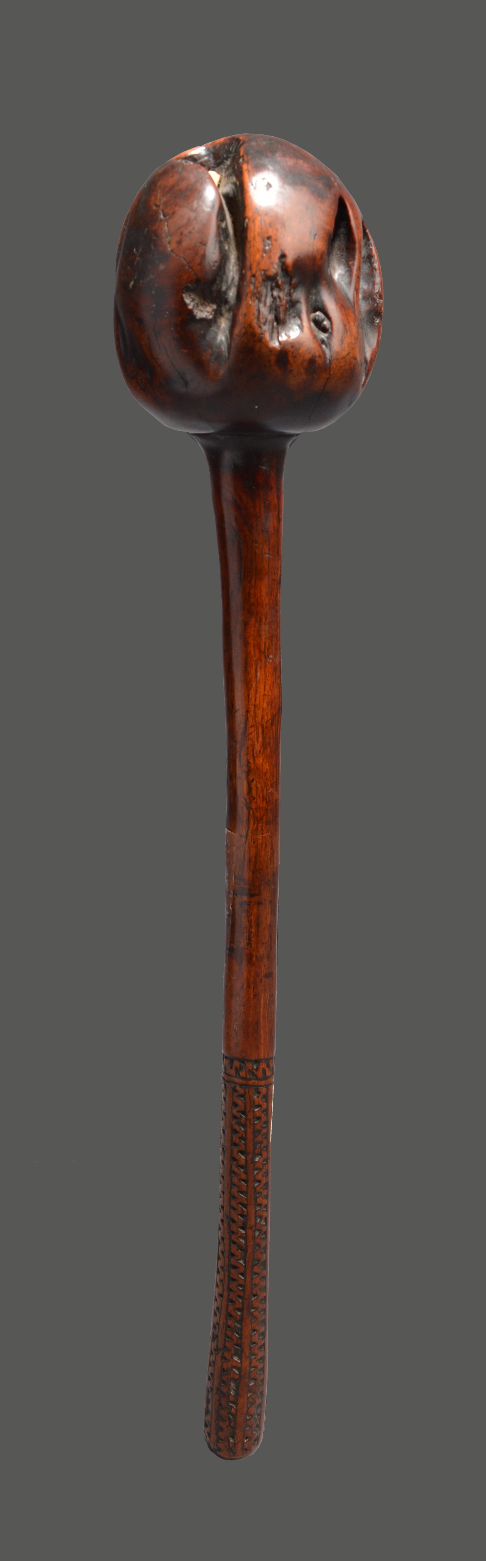 the ovoid head with an inset tooth, with a zig-zag carved grip having a concave butt and with an attachment piercing,