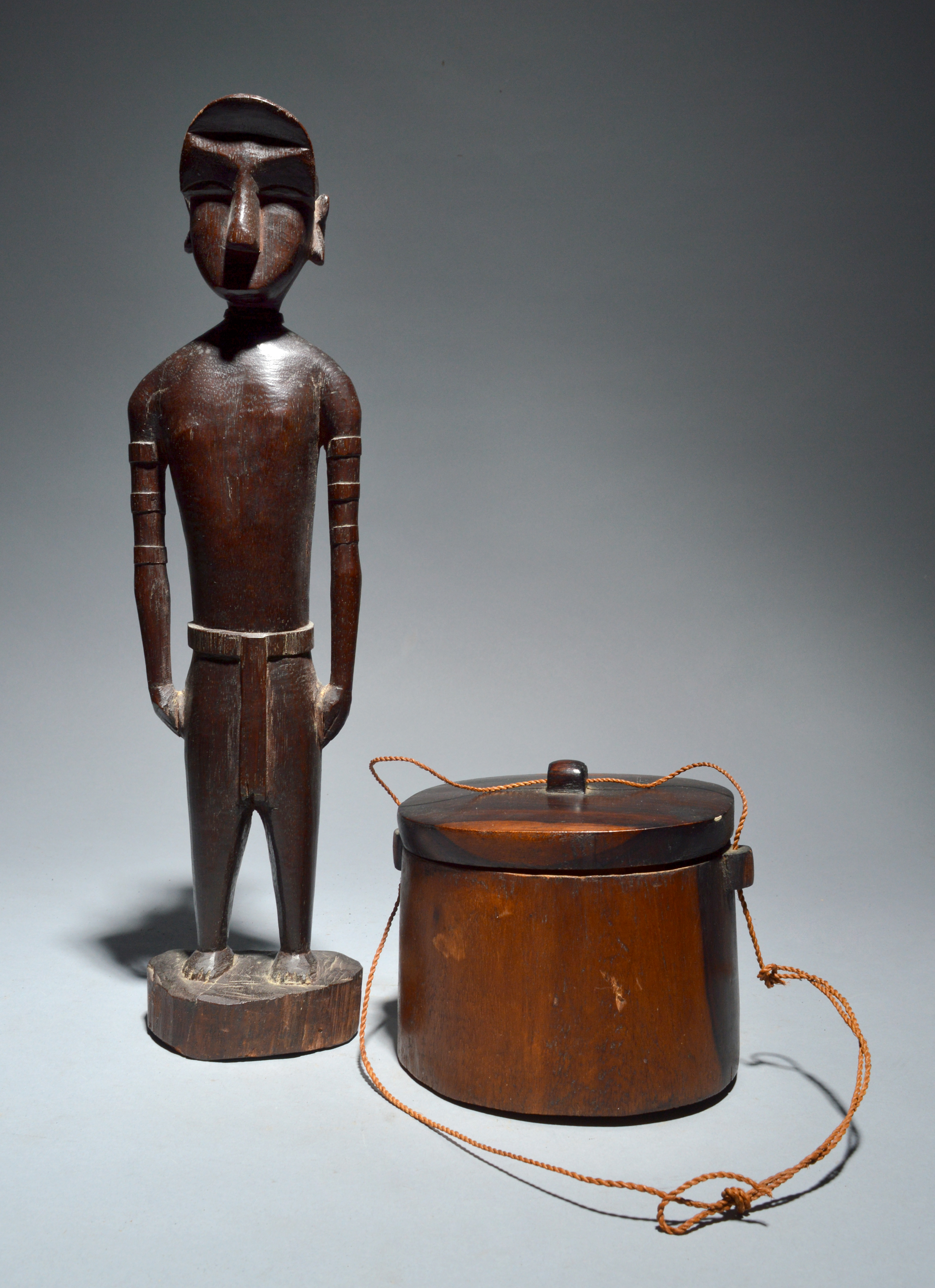 and a Tokelau Islands fish hook container and cover, 12.5cm high. (3)