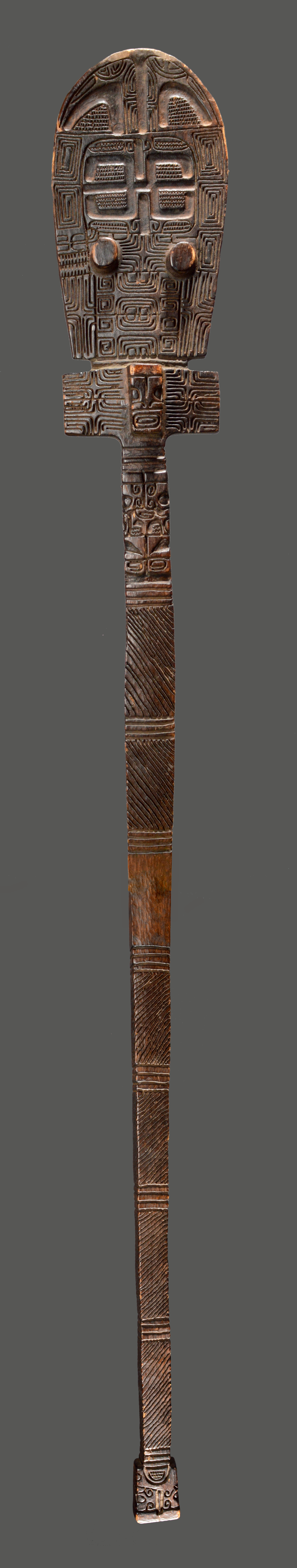 of U'u form with carved geometric and tiki decoration, the shaft with linear panels and Janus head terminal,