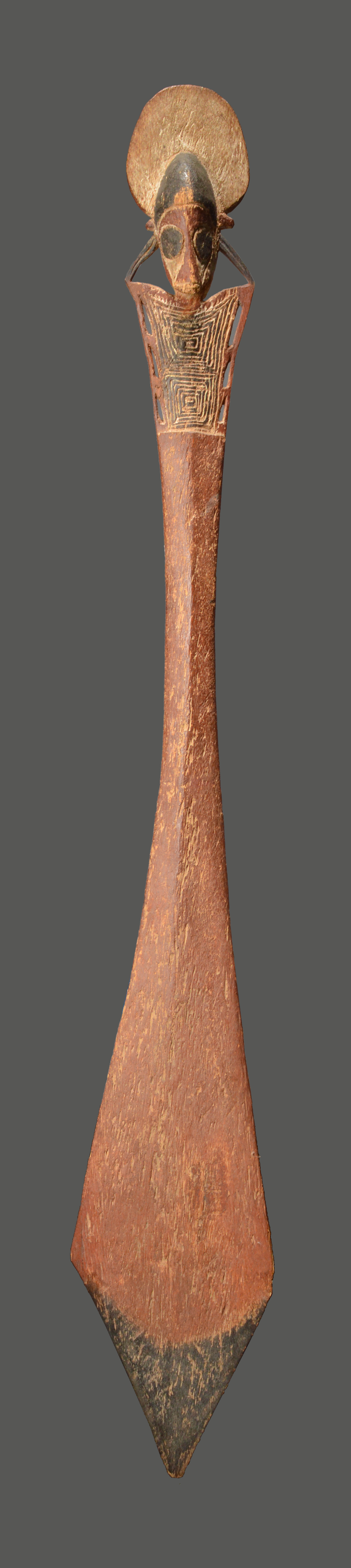the Janus head finial with a crescent headdress above a geometric carved panel and a ridged shaft and blade, with pigment decoration,