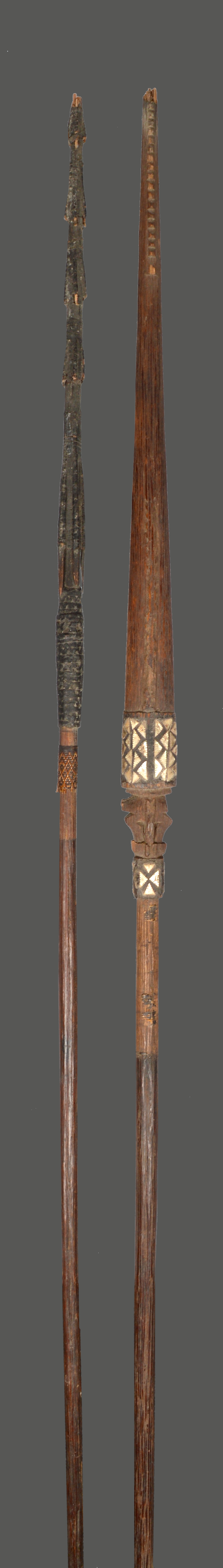 A Solomon Islands spear Melanesia with shell inlay and with two carved figures