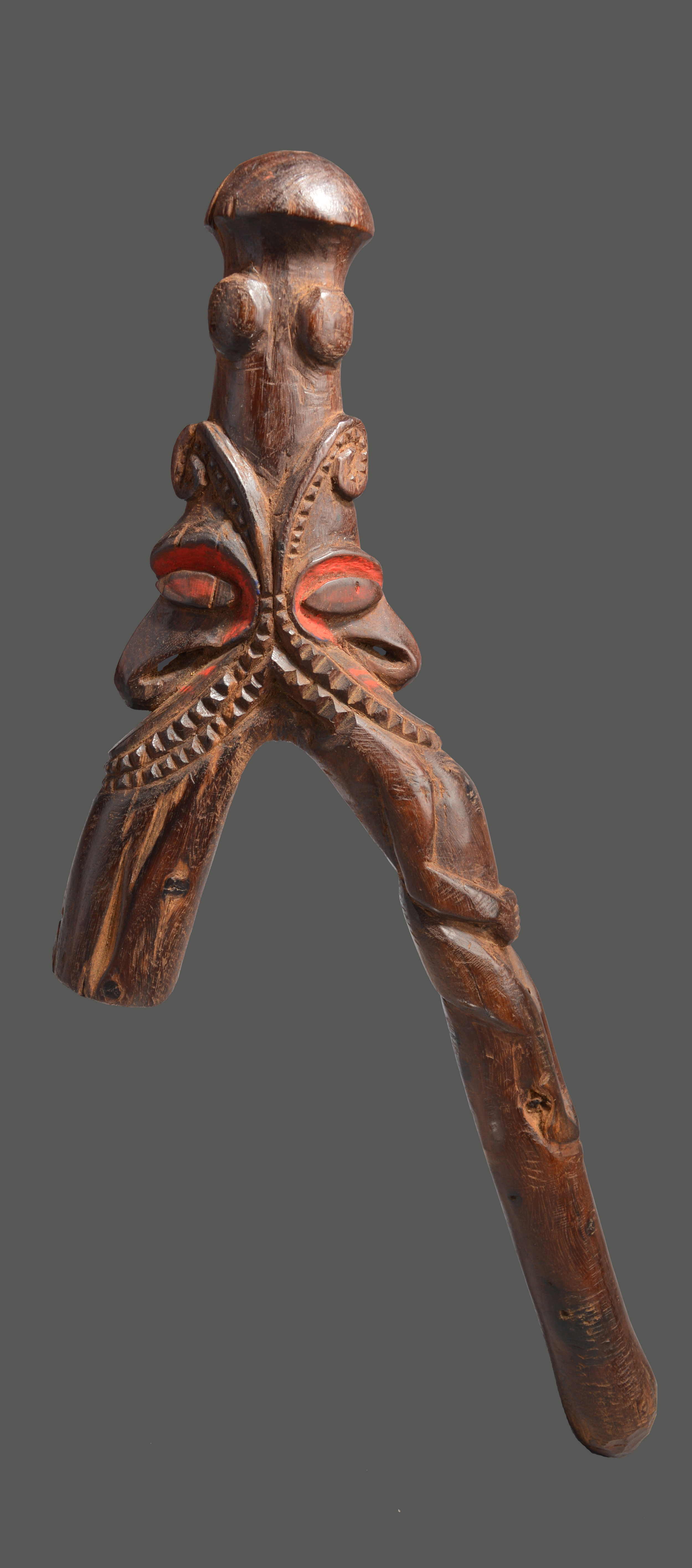 with a phallic finial above a mask and a figure, with red pigment,