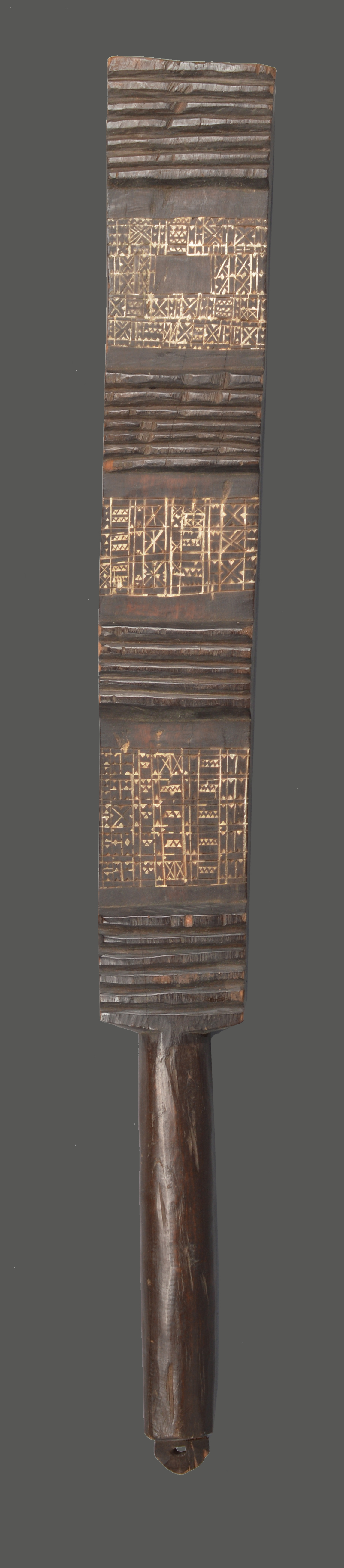 A Samoa club Polynesia the heavy blade with ribs and panels of carved and pigment filled...