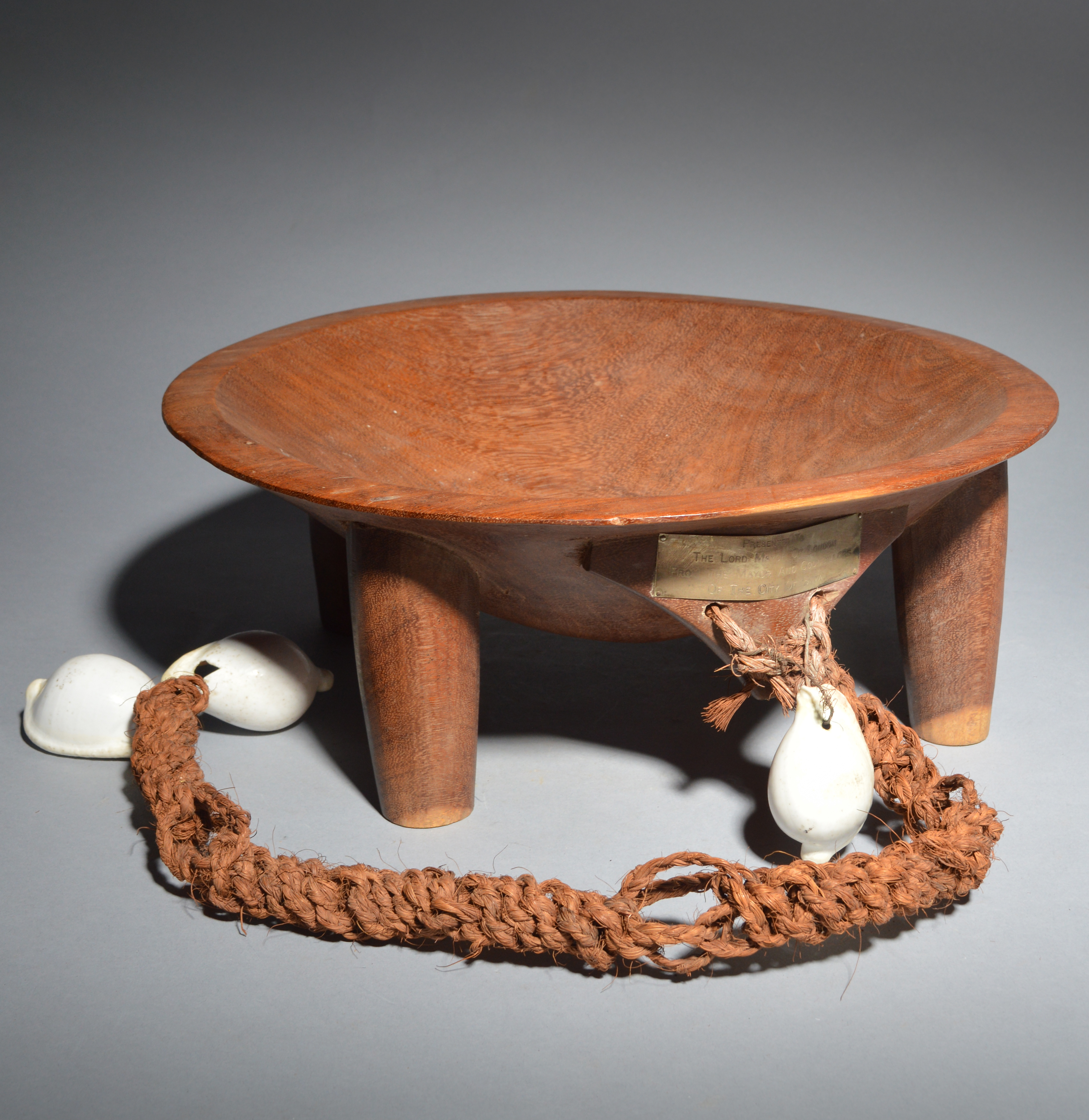 A Fiji kava bowl Melanesia with attached sennit and three cowrie shells