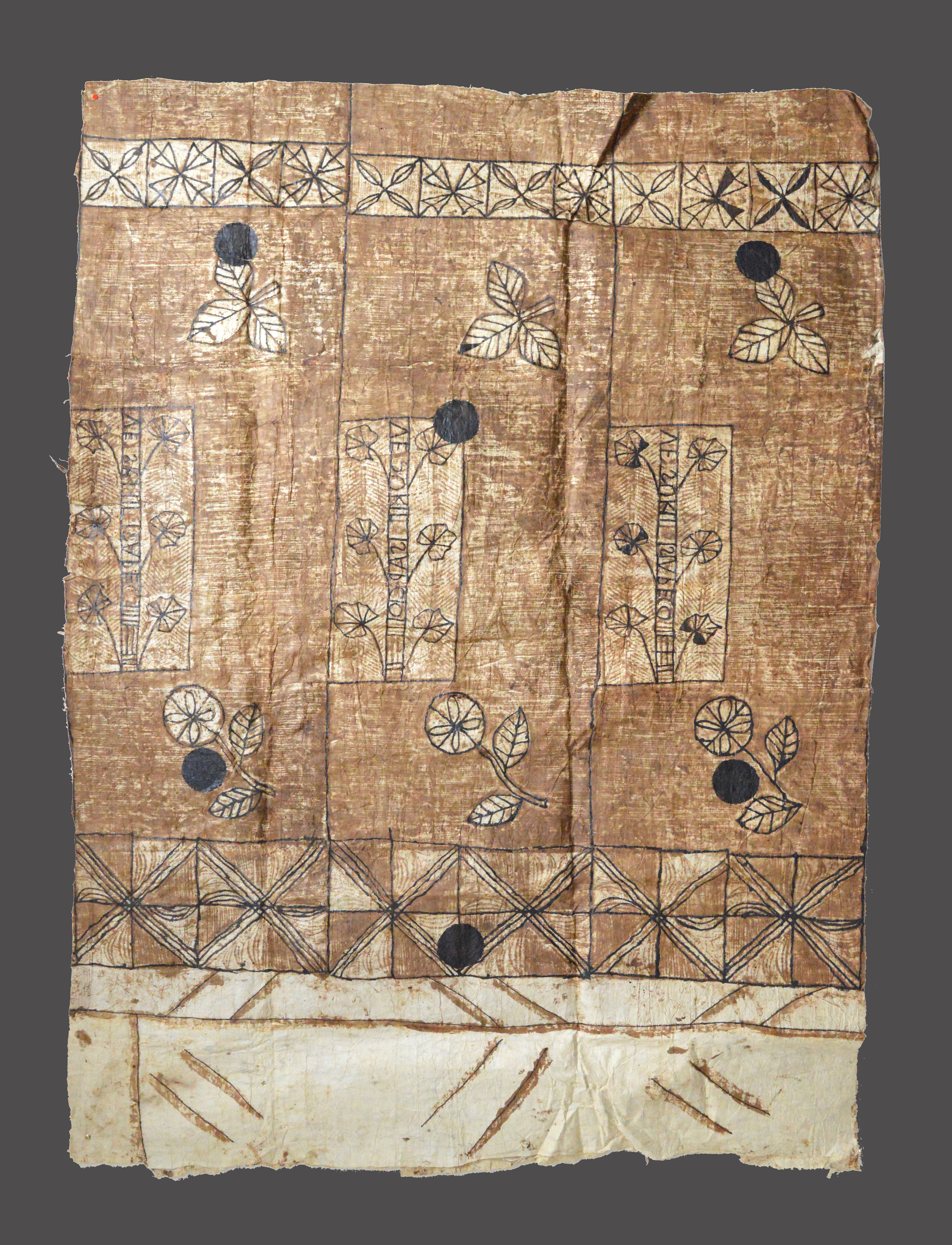 A Samoa tapa cloth Polynesia with painted foliage and geometric decoration with three panels of text
