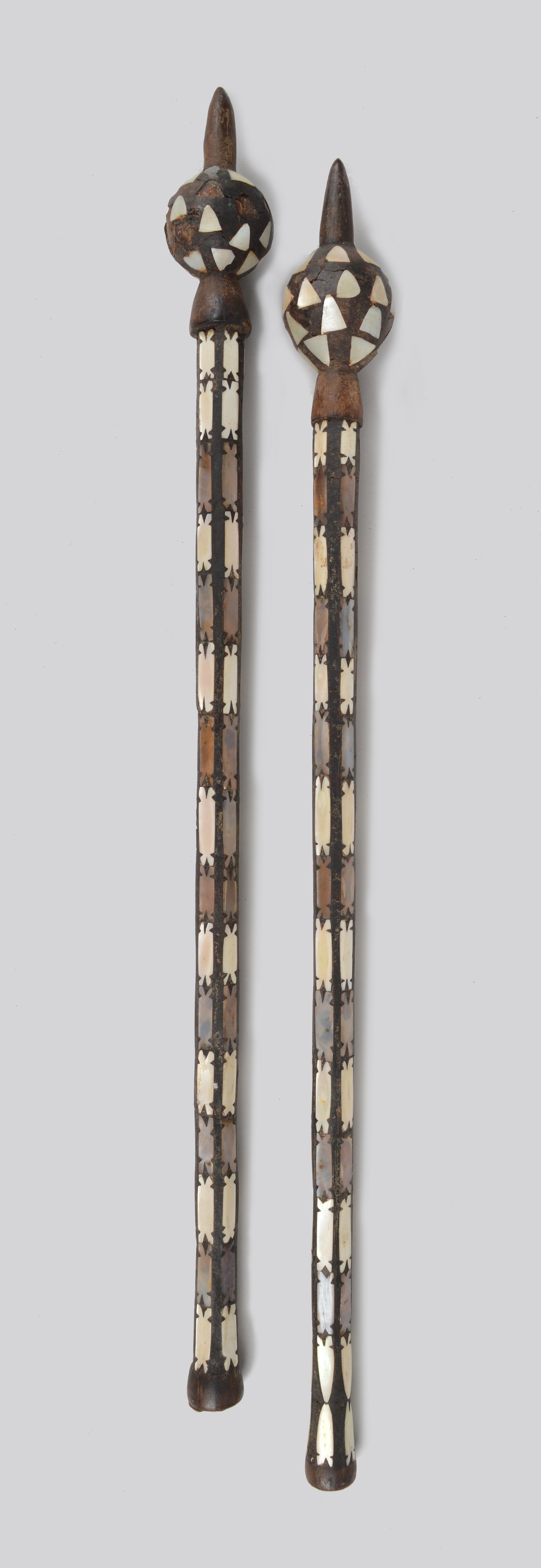 Two Solomon Islands ceremonial staffs wari haw Melanesia with shell inlay and gum