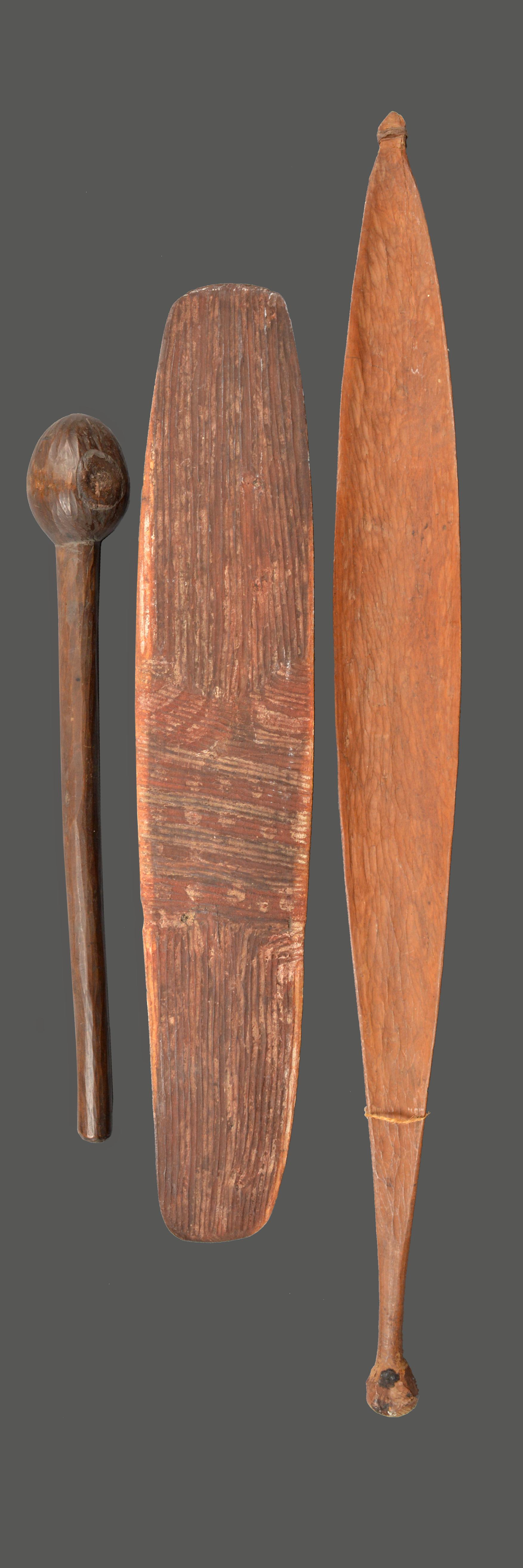 an Aboriginal spear thrower woomera, 87.5cm and a short club, 47.5cm long. (3)
