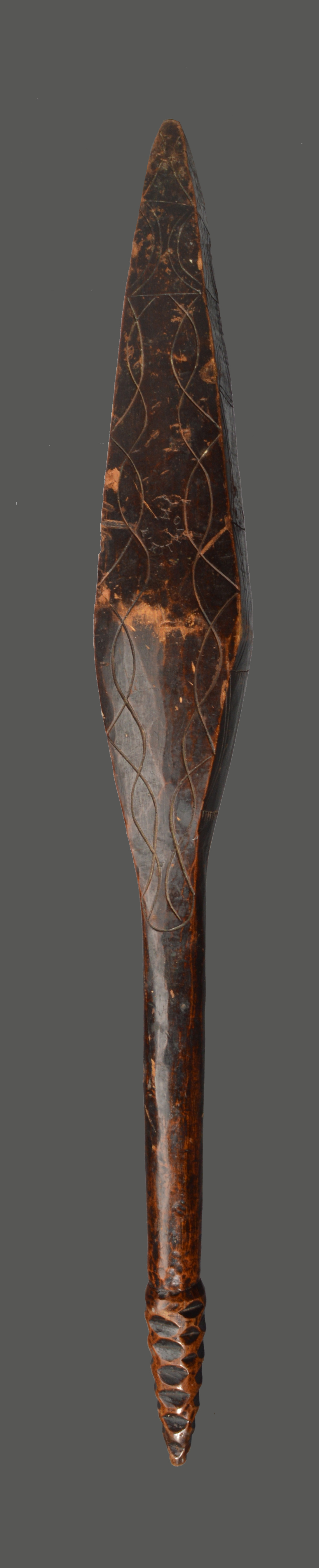 An Aboriginal club Australia with a lozenge shape head having incised linear decoration and...