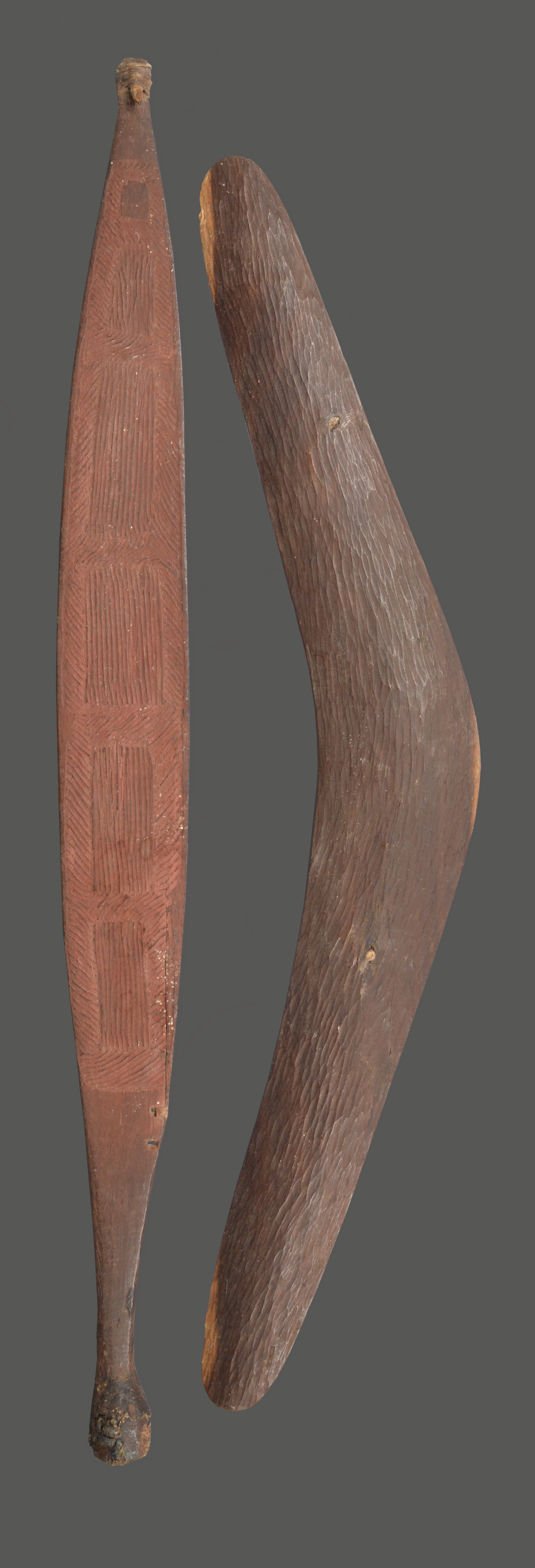 and an Aboriginal boomerang, finely textured, 77cm long. (2)