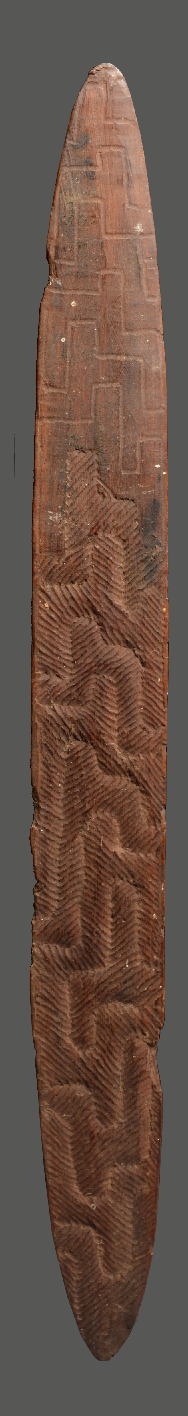 of navette shape with fine cushioned carved linear decoration, unfinished, the back inscribed Mandora Station, Port Hedland, W.A. 1969,