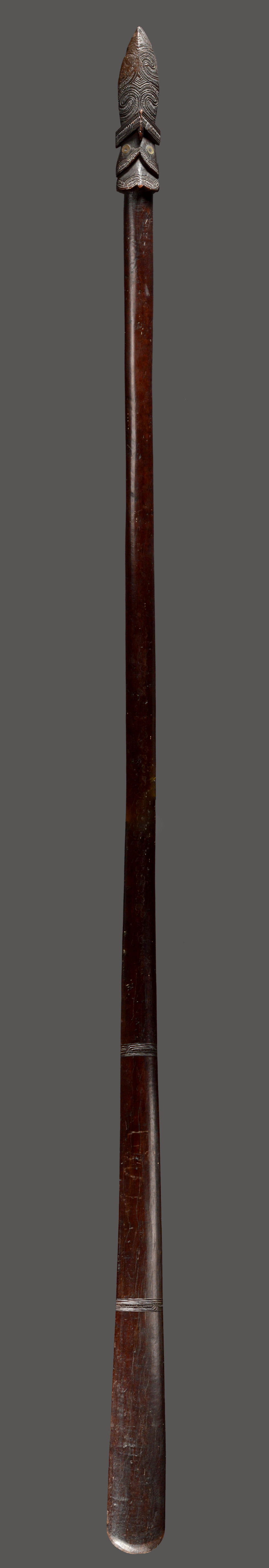 A Maori taiaha staff New Zealand with a carved Janus head and tongue finial with haliotis eyes...
