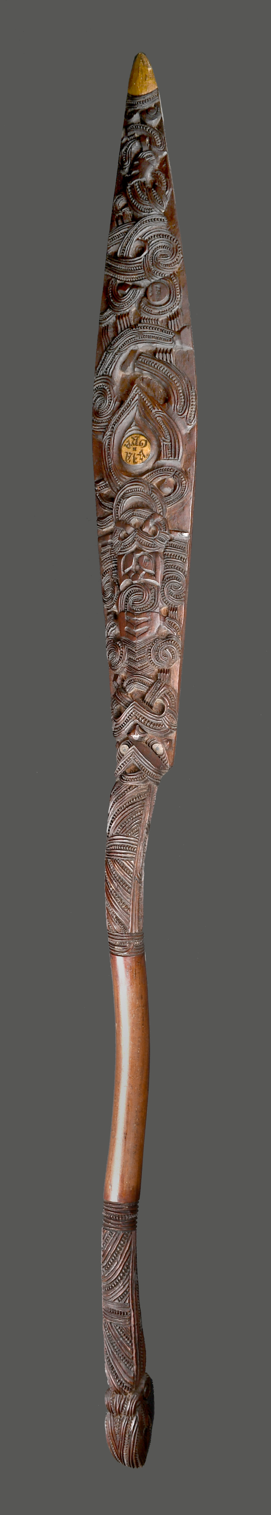 with a slender leaf shape blade and scroll handle, carved tiki, scrolls and notches, the tip painted gilt and the centre of the blade inscribed with the greeting Kia Ora,