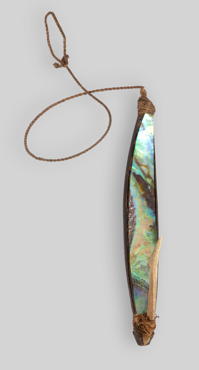 wood, haliotis shell, bone and fibre,