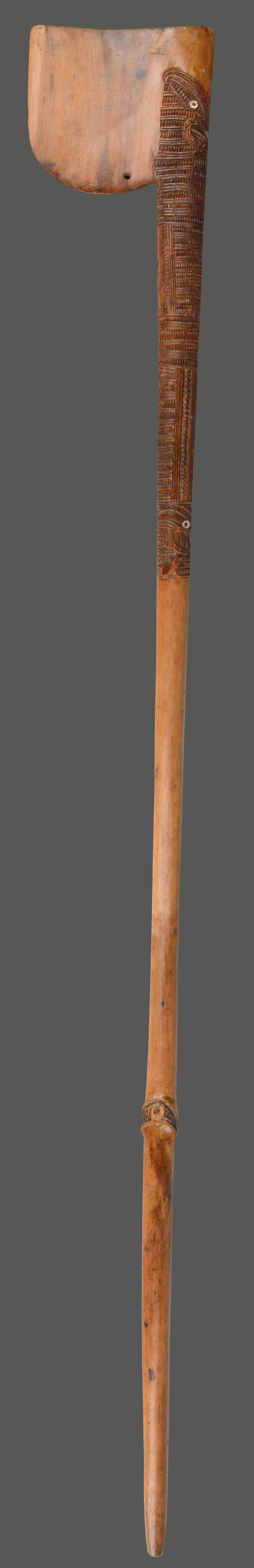 with a rounded blade, pierced for attachment, with carved linear and notch decoration and two tiki masks with haliotis eyes to the top section of the shaft, with a further janus tiki mask and a tapering terminal,