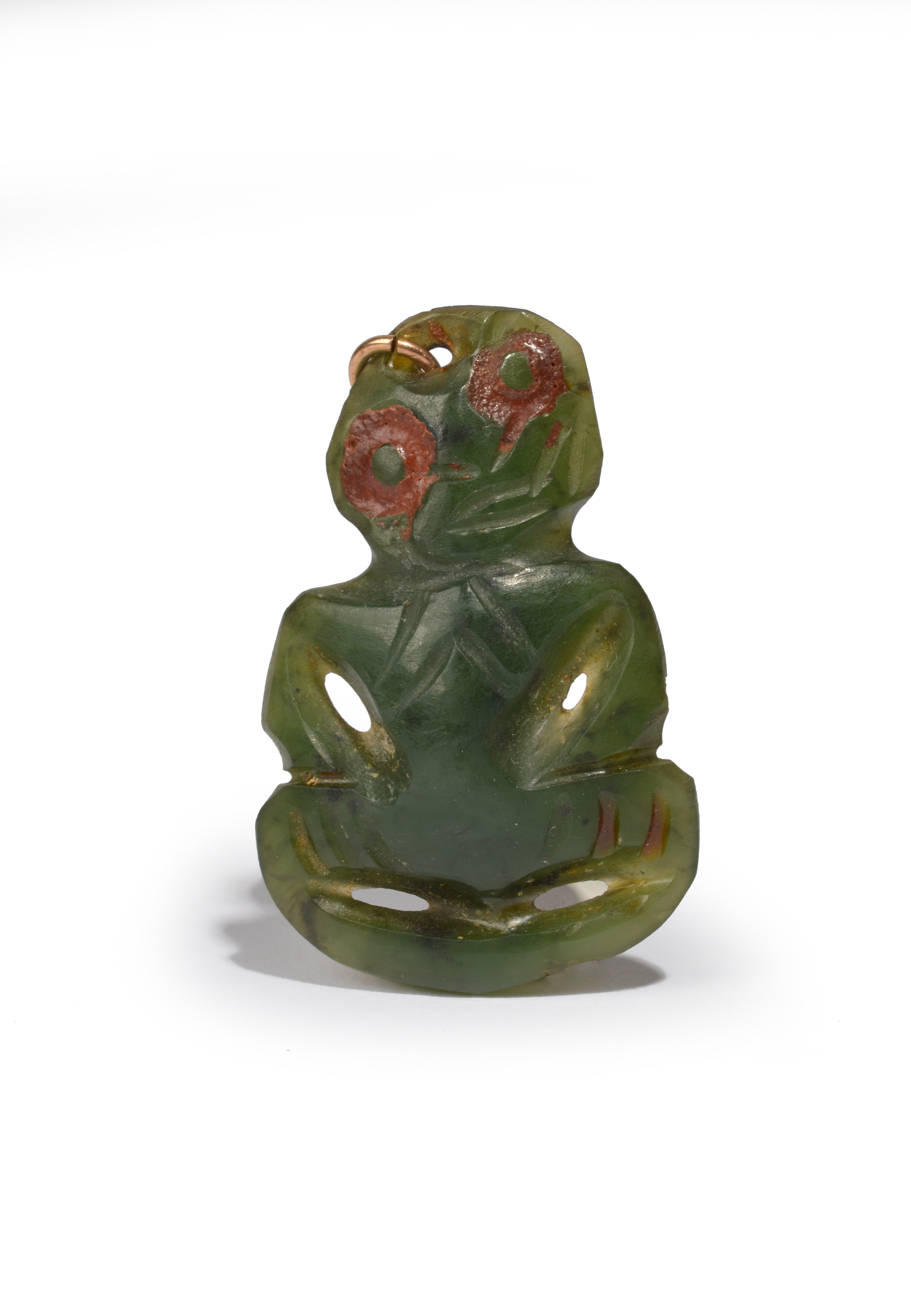 A Maori hei-tiki pendant New Zealand nephrite with red wax to the eyes