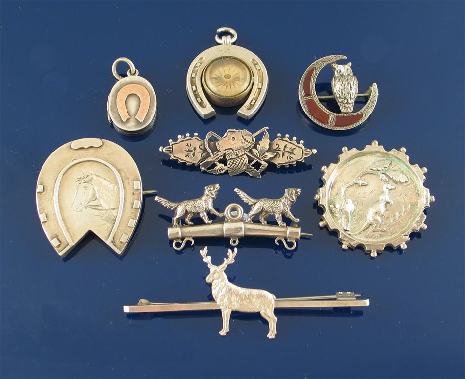 Crescent moon with hardstone inlay and owl, 2.5cm. Horse and horseshoe. Red deer stag. Two dogs with paste eyes. A dog with gun. Horseshoe and compass pendant, Chester 1890. Gold faced horseshoe locket pendant. Kangaroo. (8)