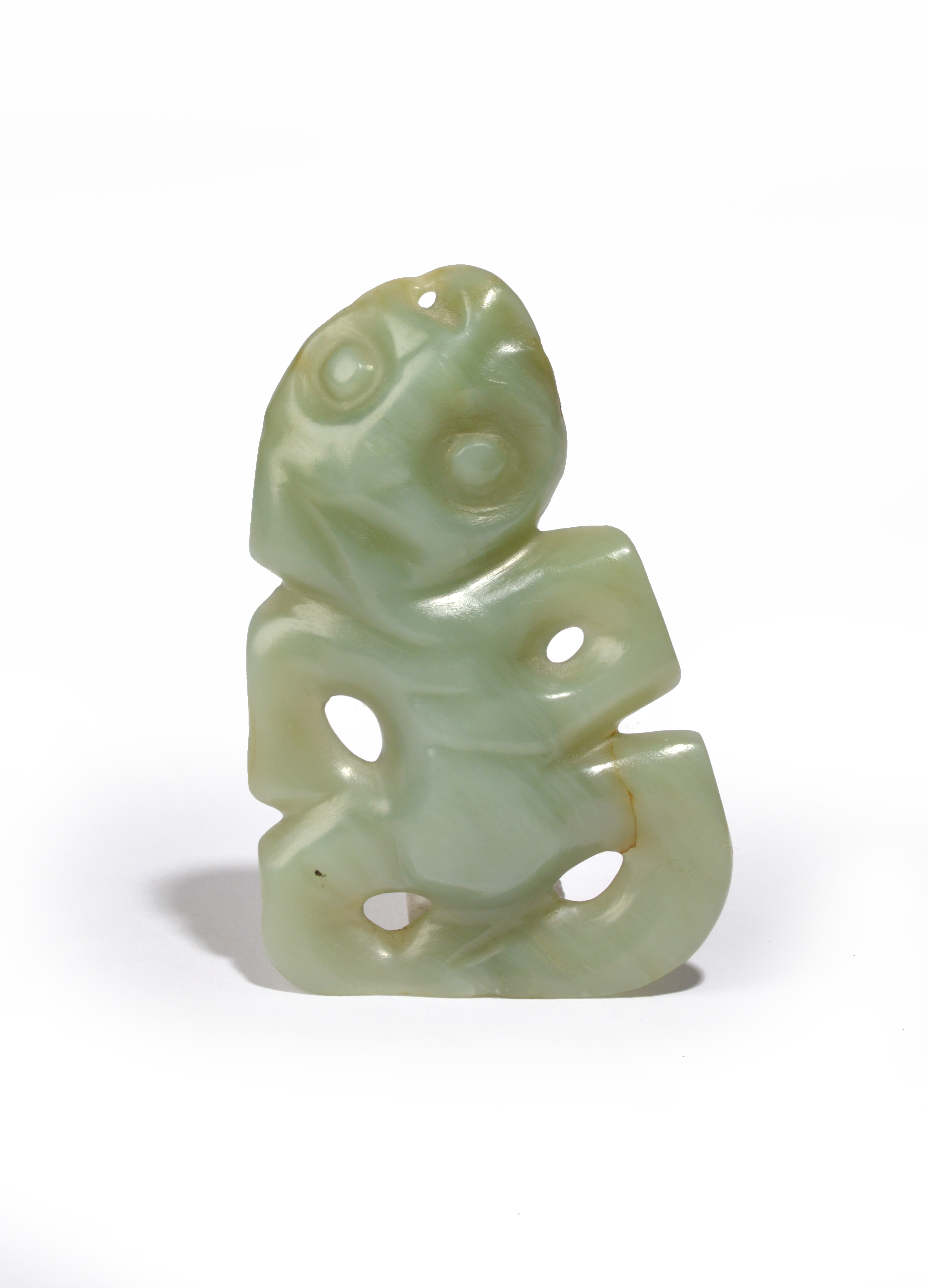 nephrite, with one hand on the hip and the other on the chest, with a sticking out tongue and suspension hole,