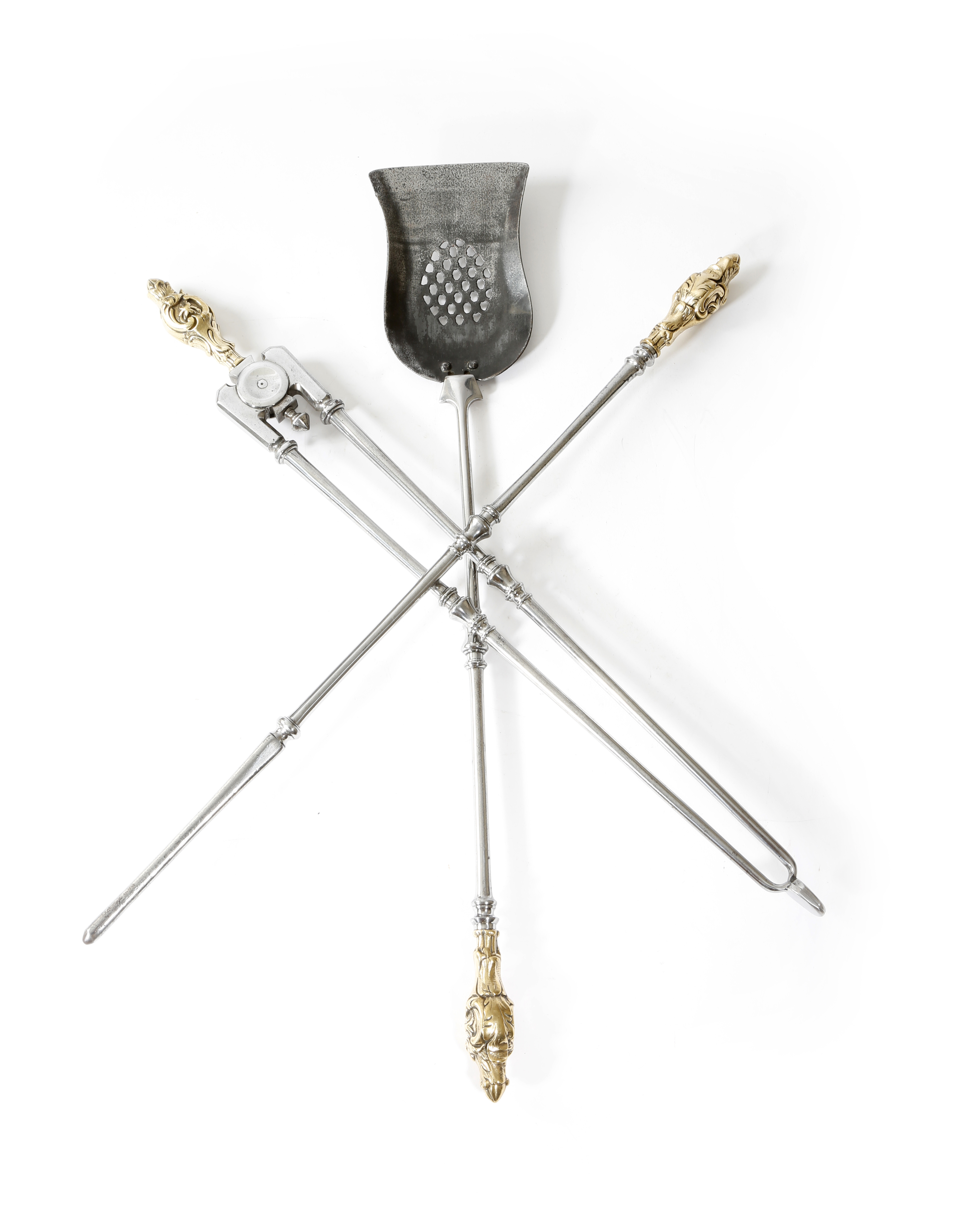 A set of three steel fire irons, each with a brass Rococo style handle, with knopped stems and a pierced pan, 73.6cm long (max). (3)