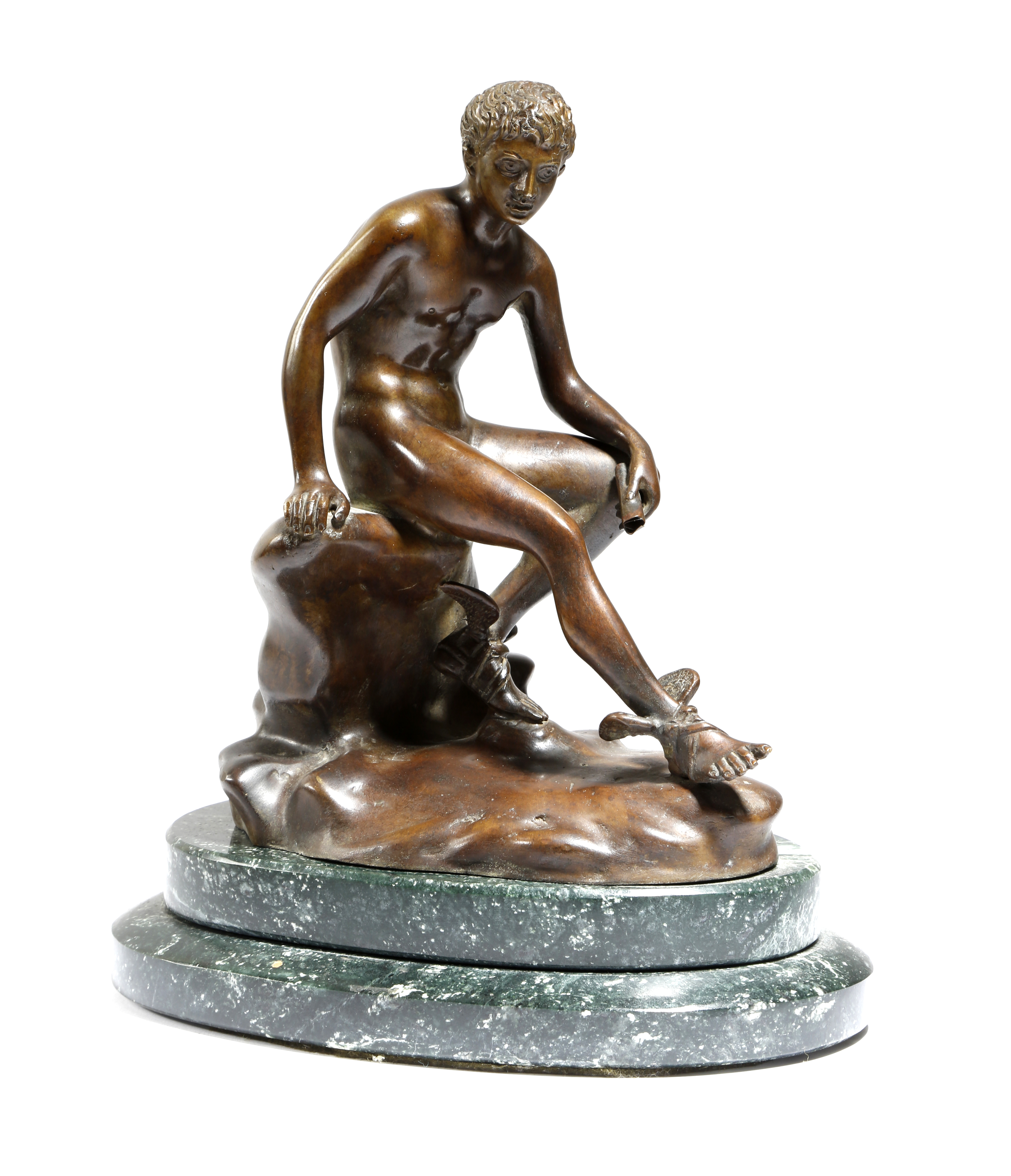 After the antique. An Italian Neapolitan bronze Grand Tour figure of Mercury, seated at rest on a marble rocky outcrop, by the Chiurrazzi foundry, with a pastille and inscribed 'CHIURAZZI NAPOLI LISIPPO', on a stepped green marble base, late 19th / early 20th century, 24.7cm high.