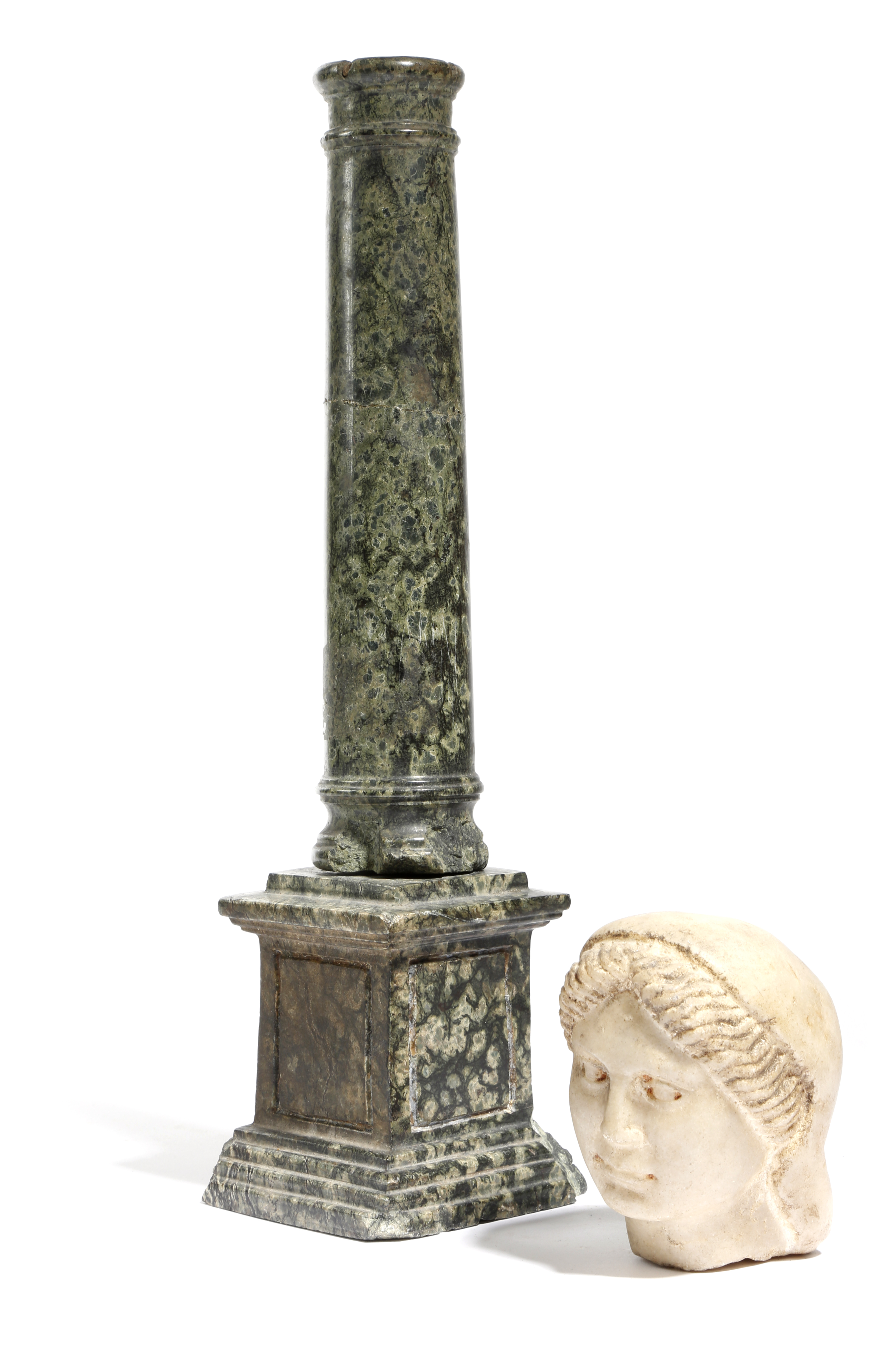 An 18th century Italian serpentine Grand Tour model of a column, 30.7cm high, together with an Italian carved marble bust of a Greek lady. (2)