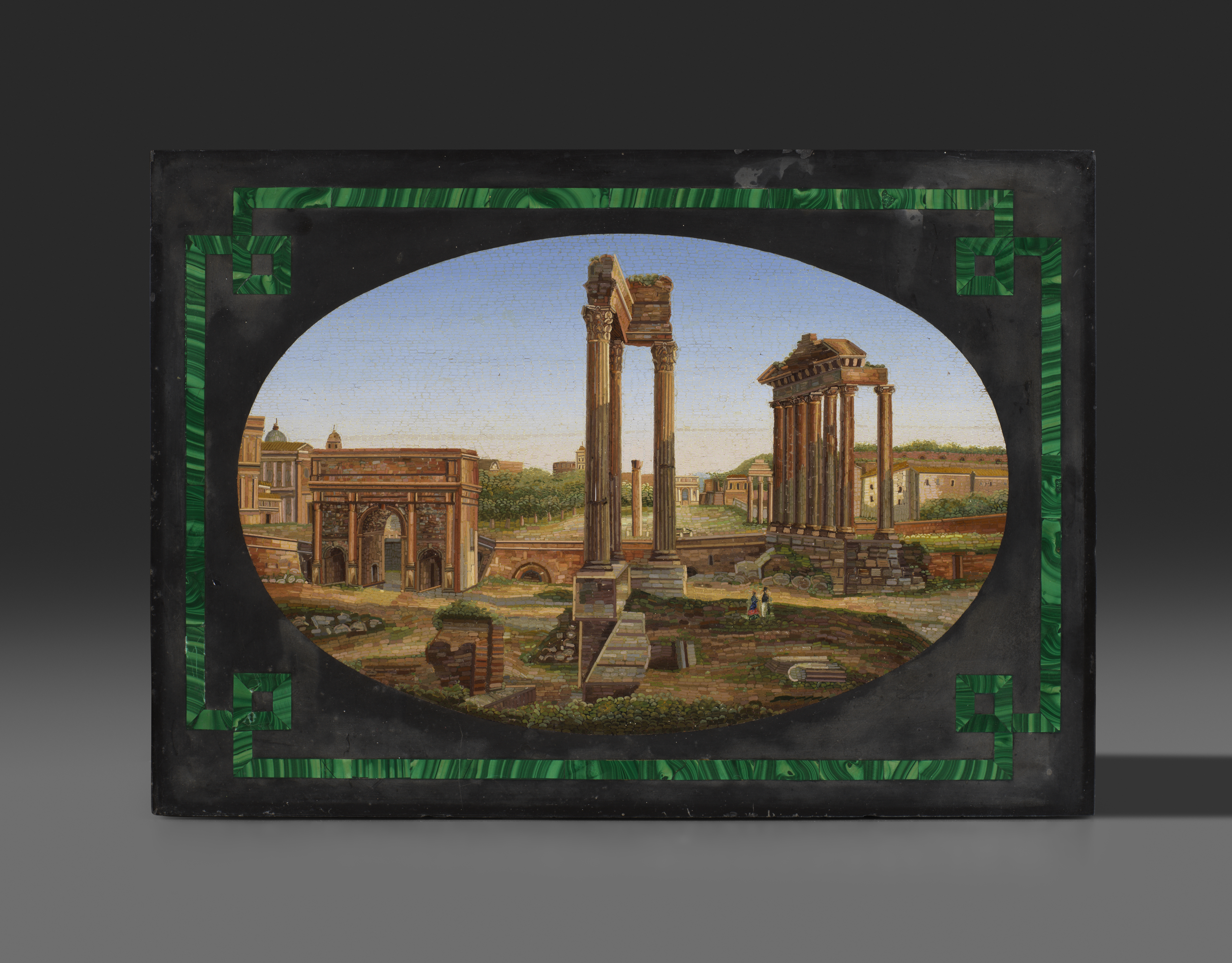 A late 19th century Italian Roman micromosaic Grand Tour plaque, the oval panel depicting the Roman Forum, with a pair of figures walking amongst the three columns of the Temple of Castor and Pollux, the remains of Temple of Vespasian, the Temple of Saturn and to the left the Arch of Septimus Severus and in the distance the Arch of Titus and the Column of Phocas, set in a black marble and malachite bordered outer frame, 25.5 x 36cm.