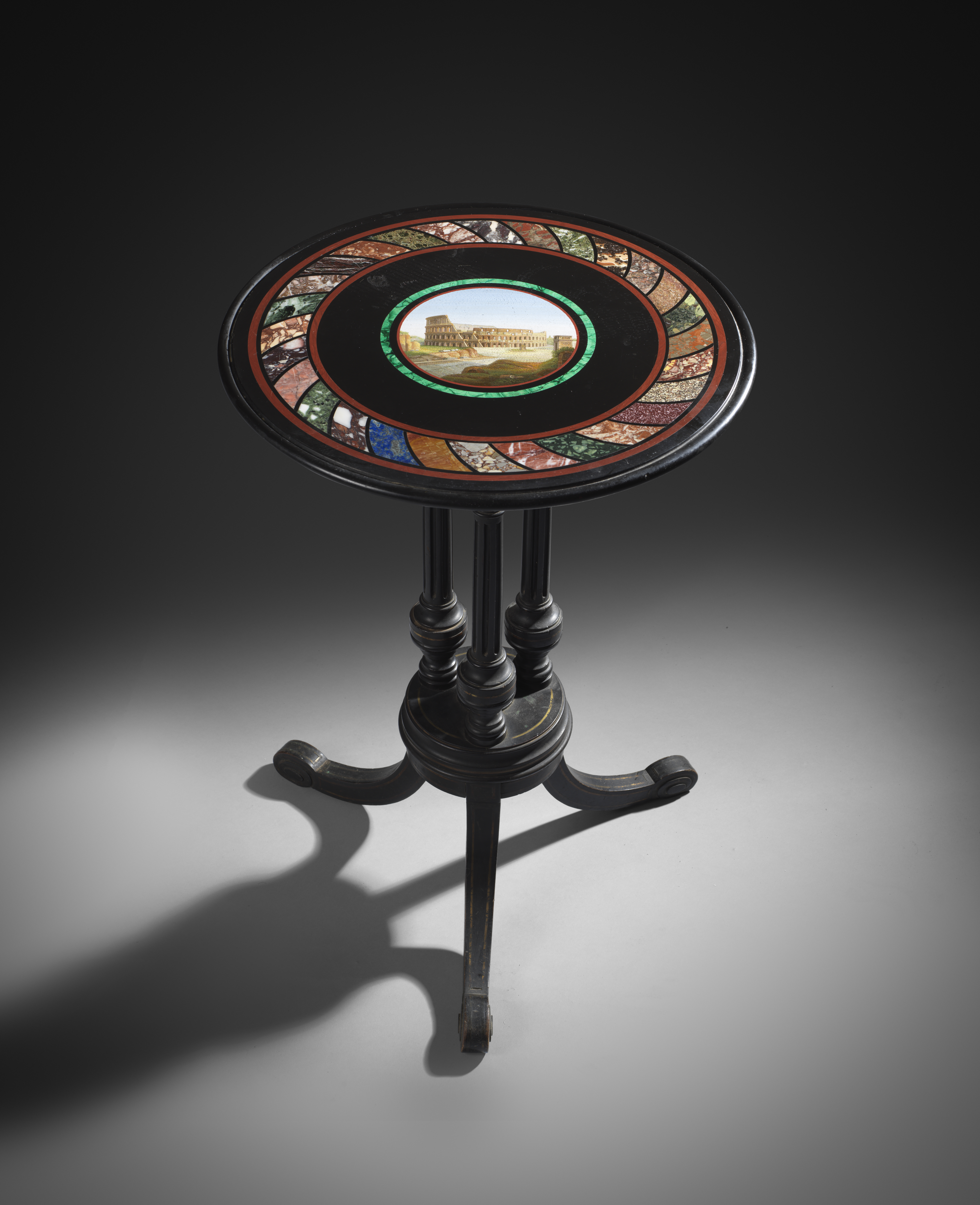 A 19th century Italian Roman micromosaic Grand Tour circular table top, the black marble centred with a micromosaic rondel depicting the Colosseum, within a malachite border and an outer band of specimen hardstones, including: porphyry, lapis lazuli and various marbles, 51cm diameter, on an ebonised wood and parcel gilt base with triple column supports and scroll legs, 73.9cm high (overall).