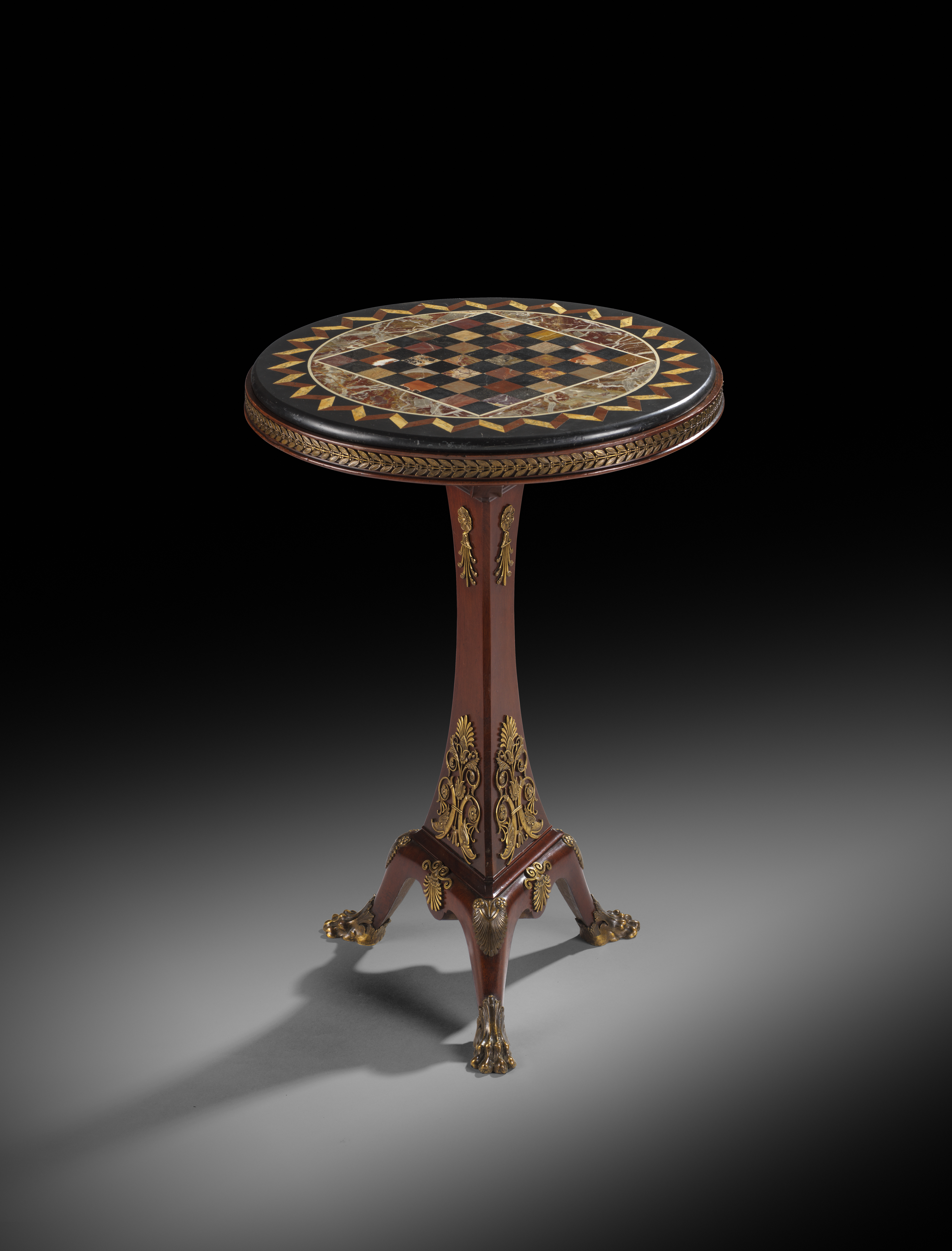 A Napoleon III mahogany guéridon, ormolu mounted, the circular inset specimen marble top inlaid with a chequer board with various marbles, with a geometric outer band and with a laurel band, above a triform stem decorated with rosettes, anthemion motifs and dolphins, on tripod paw sabots, 77.2cm high, 52cm diameter.