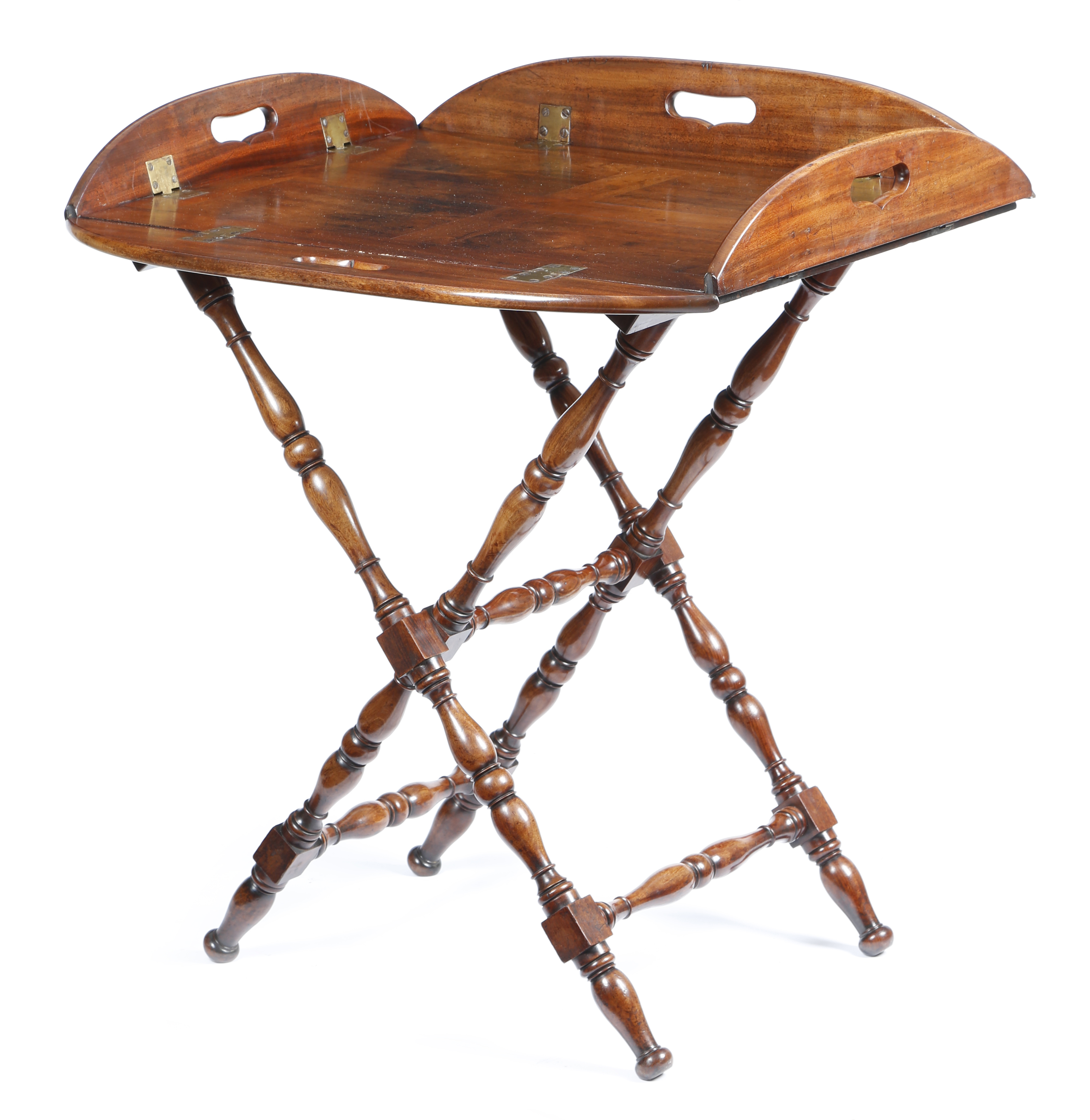 An early 19th century mahogany butler's tray on stand, with four hinged sides, each pierced with a handgrip, the folding stand with ring turned baluster supports, 76.2cm high, 73 x 87.8cm (open).