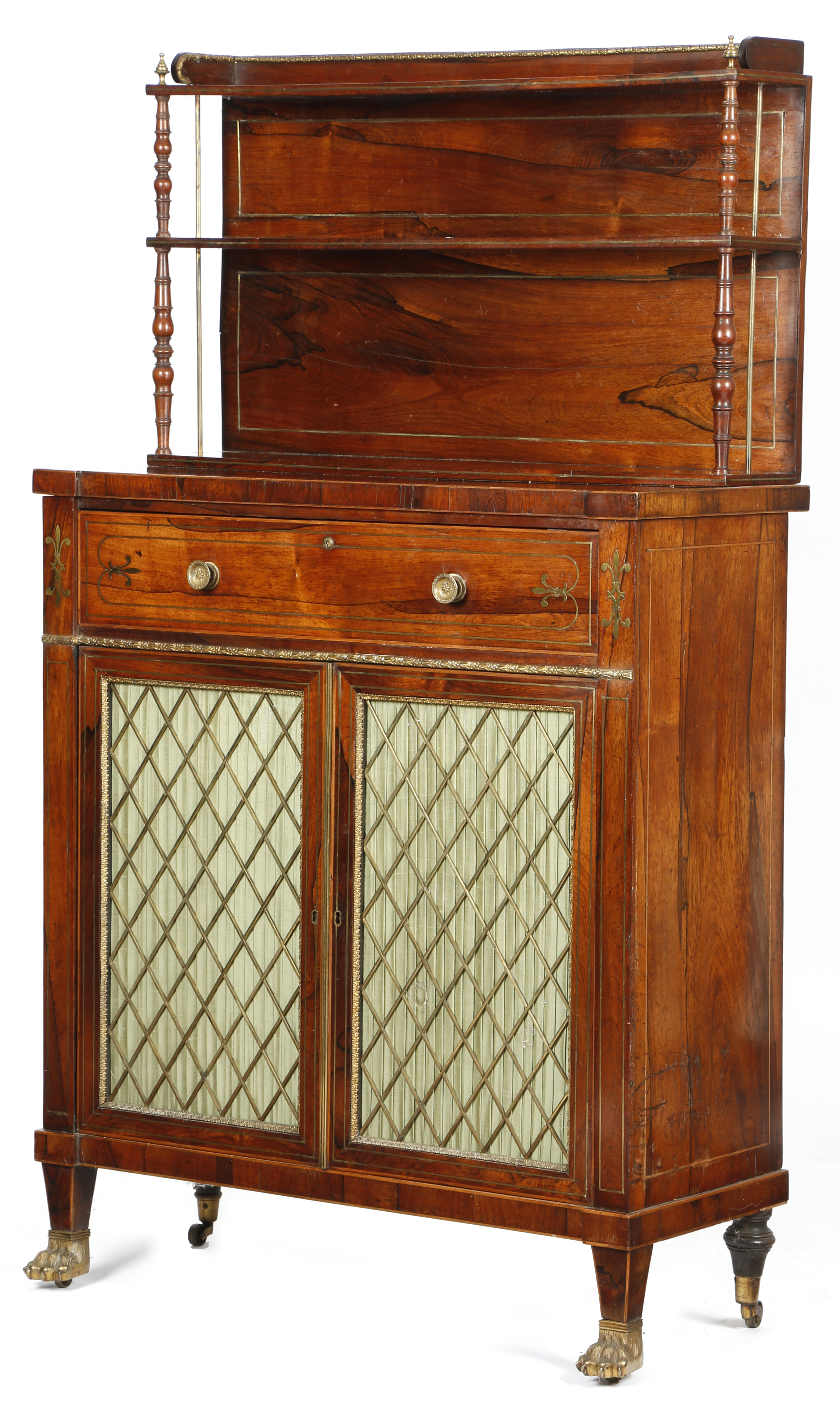 λ A Regency rosewood and brass mounted side cabinet, with a lappet and floret moulding, the raised back with two shelves, with turned column supports, above a frieze drawer inlaid with fleur-de-lis and with a pair of gilt brass lattice grille doors with pleated silk panels enclosing a shelves, on cast brass lion's paw front feet and brass castors, 135.5cm high, 77.5cm wide, 35.8cm deep.