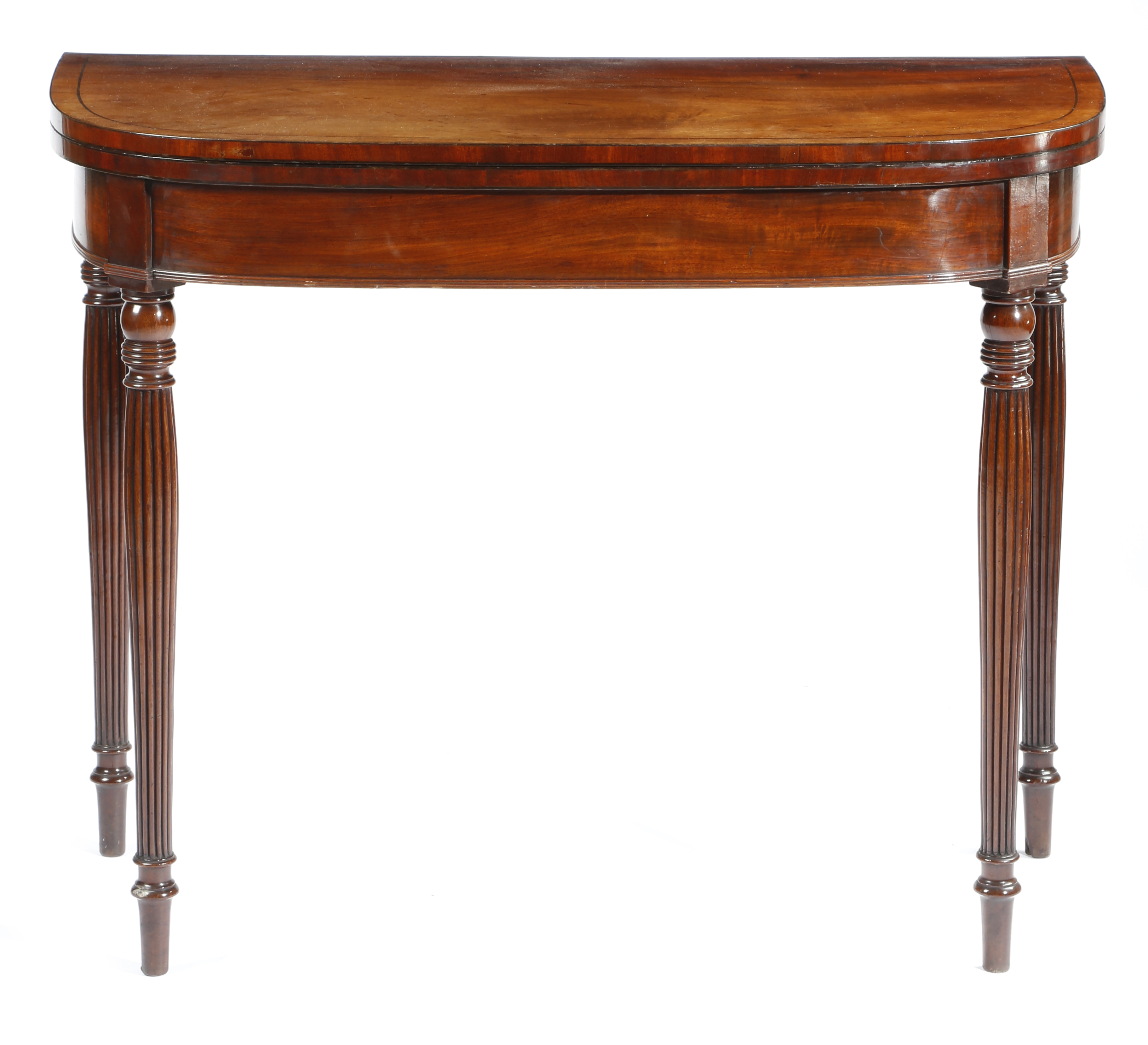 A Regency 'D' shaped tea table, inlaid with ebonised stringing, the hinged fold-over top on twin gate supports, on ring turned and baluster ribbed legs, 74cm high, 91.6cm wide, 45.2cm deep.