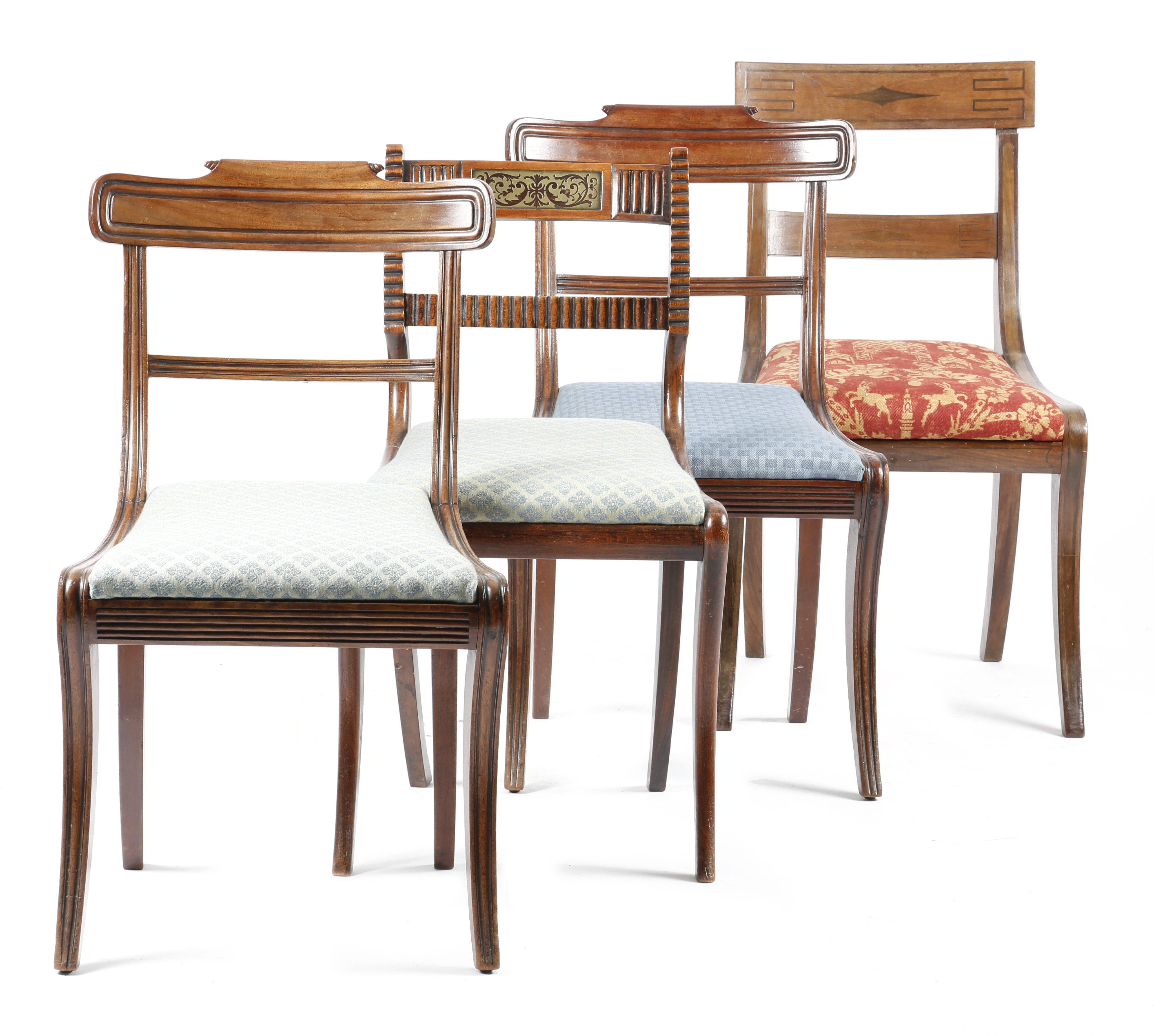 A pair of Regency mahogany side chairs, each with a curved tablet back above a drop-in seat and sabre legs, together with a simulated rosewood side chair with a ribbed back and a brass marquetry panel and a mahogany side chair with ebonised Greek key decoration. (4)