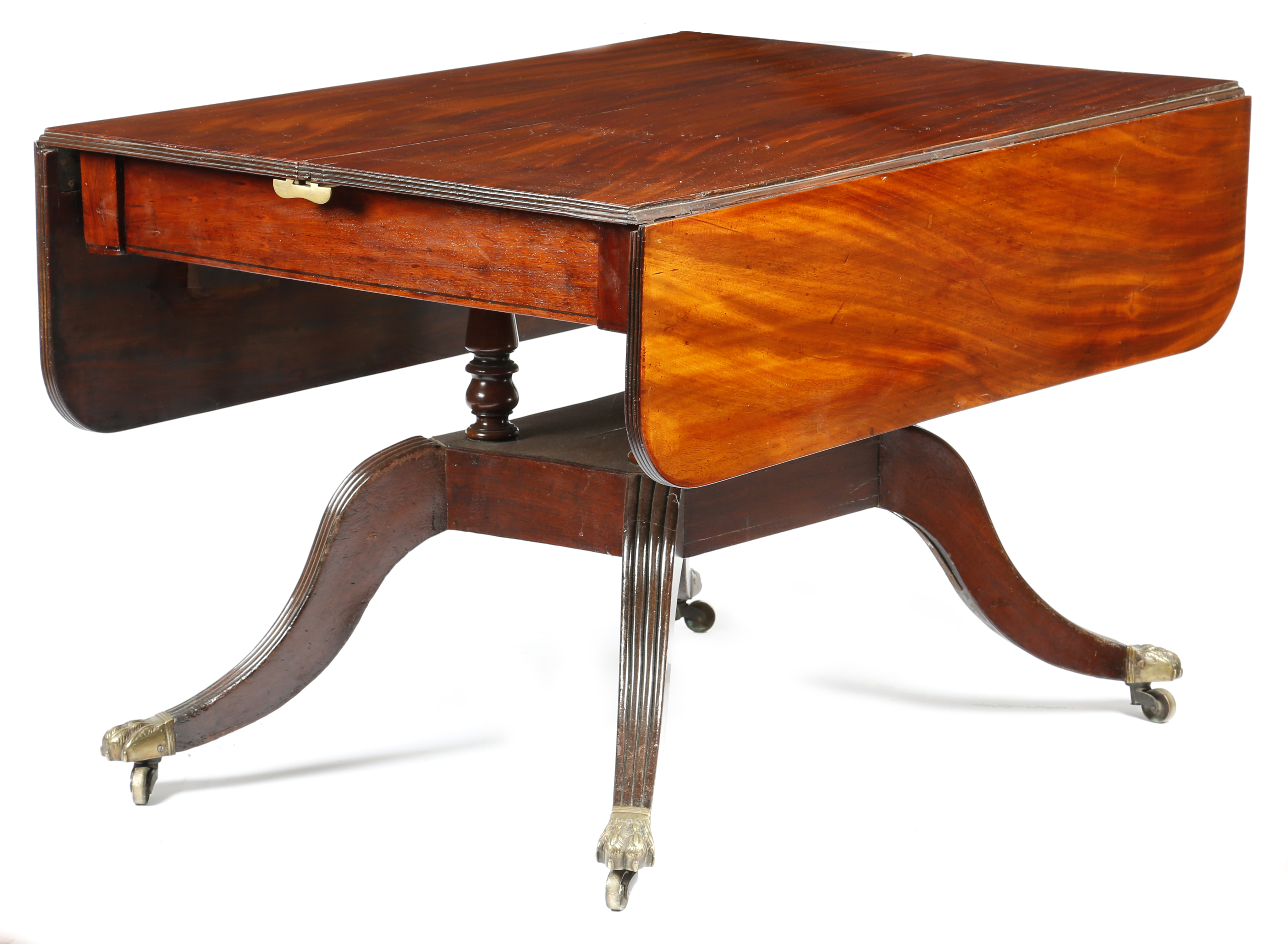 A Regency mahogany extending Pembroke dining table, inlaid with ebonised stringing, the drop-leaf top with a reeded edge, on a telescopic frame, with two additional later leaves, on four turned column supports, reeded legs and brass lion's paw sabot and castors, 72.7cm high, 214cm long (extended) 109.7cm wide.