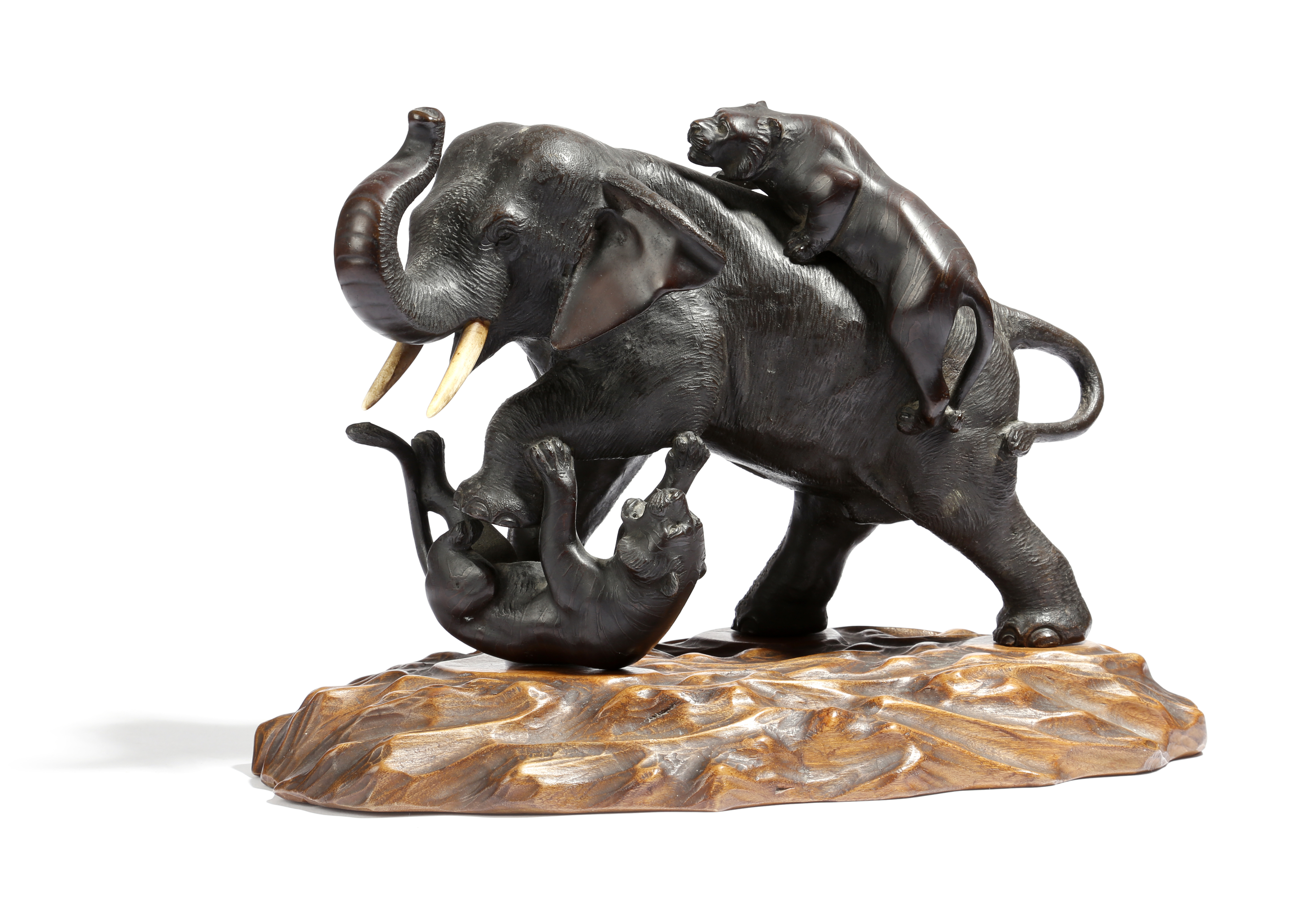 A Japanese bronze group of an elephant attacked by two tigers, with bone tusks, the underside with a signature plaque, Meiji 1868-1912, 18cm high, 27cm long, on a naturalistic carved wood base.