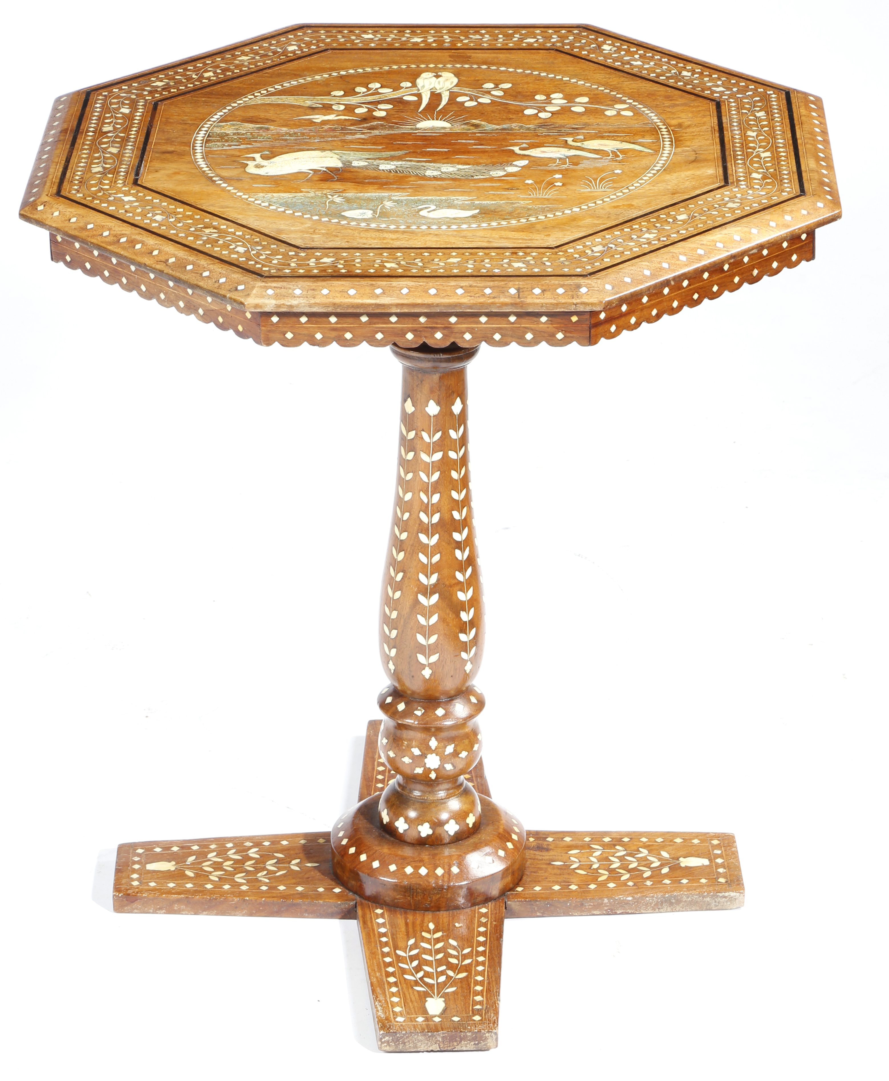 λ An Anglo-Indian hardwood occasional table by Bru Lal Mangat Ram Jain, inlaid with ivory, bone and ebony, the octagonal top with a polychrome decorated landscape scene with two pairs of peacocks, a pair of parrots on a branch and a swan, on a baluster stem and a cruciform base, the underside with printed paper labels, one inscribed 'Dabbi Bazar HOSHIARPUR Punjab India', late 19th / early 20th century, 54.5cm high, 54.8cm wide.
