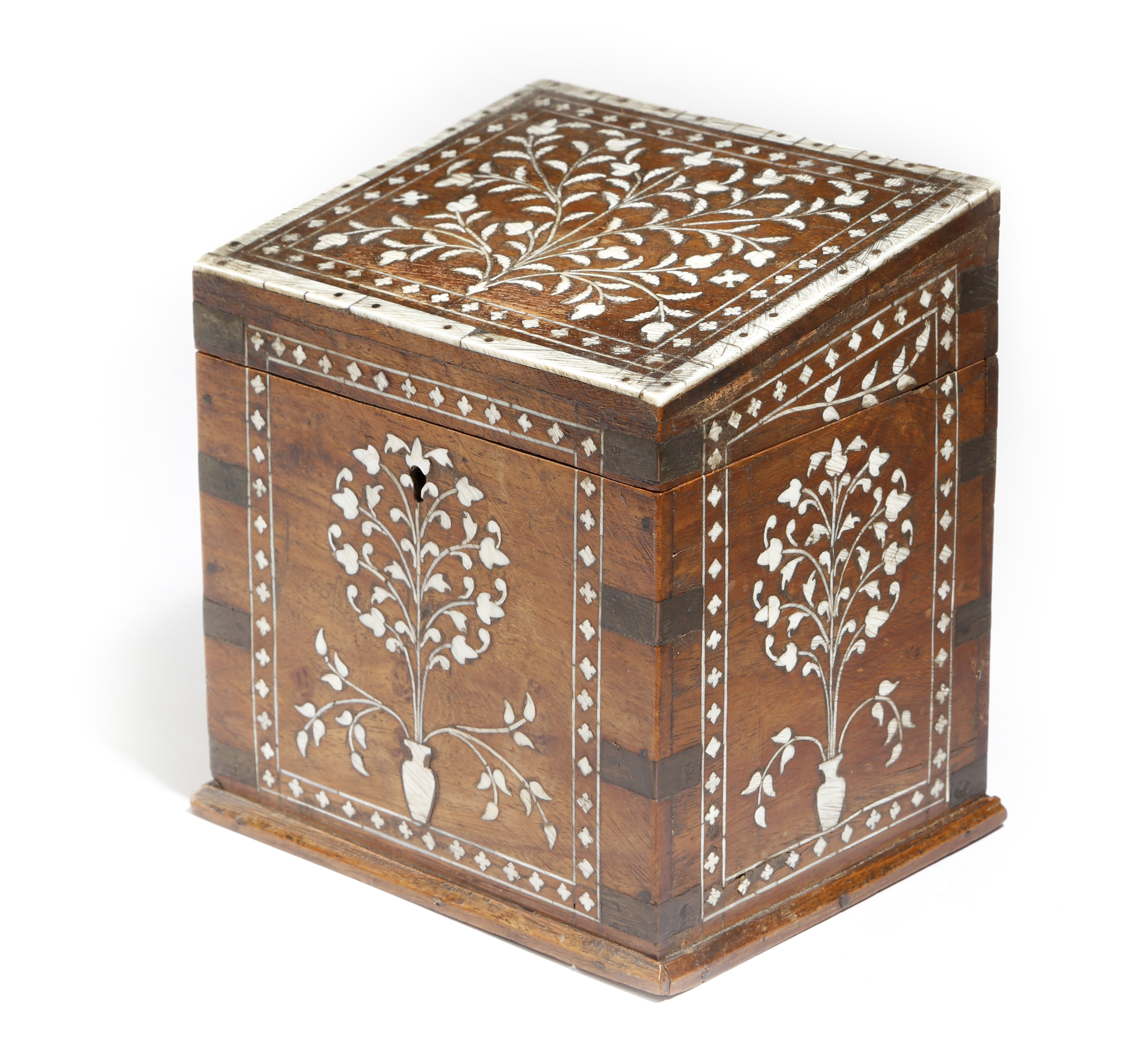 λ An Anglo-Indian hardwood tea caddy, inlaid with bone and ivory with urns of flowers and leaves, with brass mounts, the sloping lid revealing a single lidded interior, Hoshiarpur, late 19th / early 20th century, 15.7cm high, 15cm wide, 12.4cm deep.