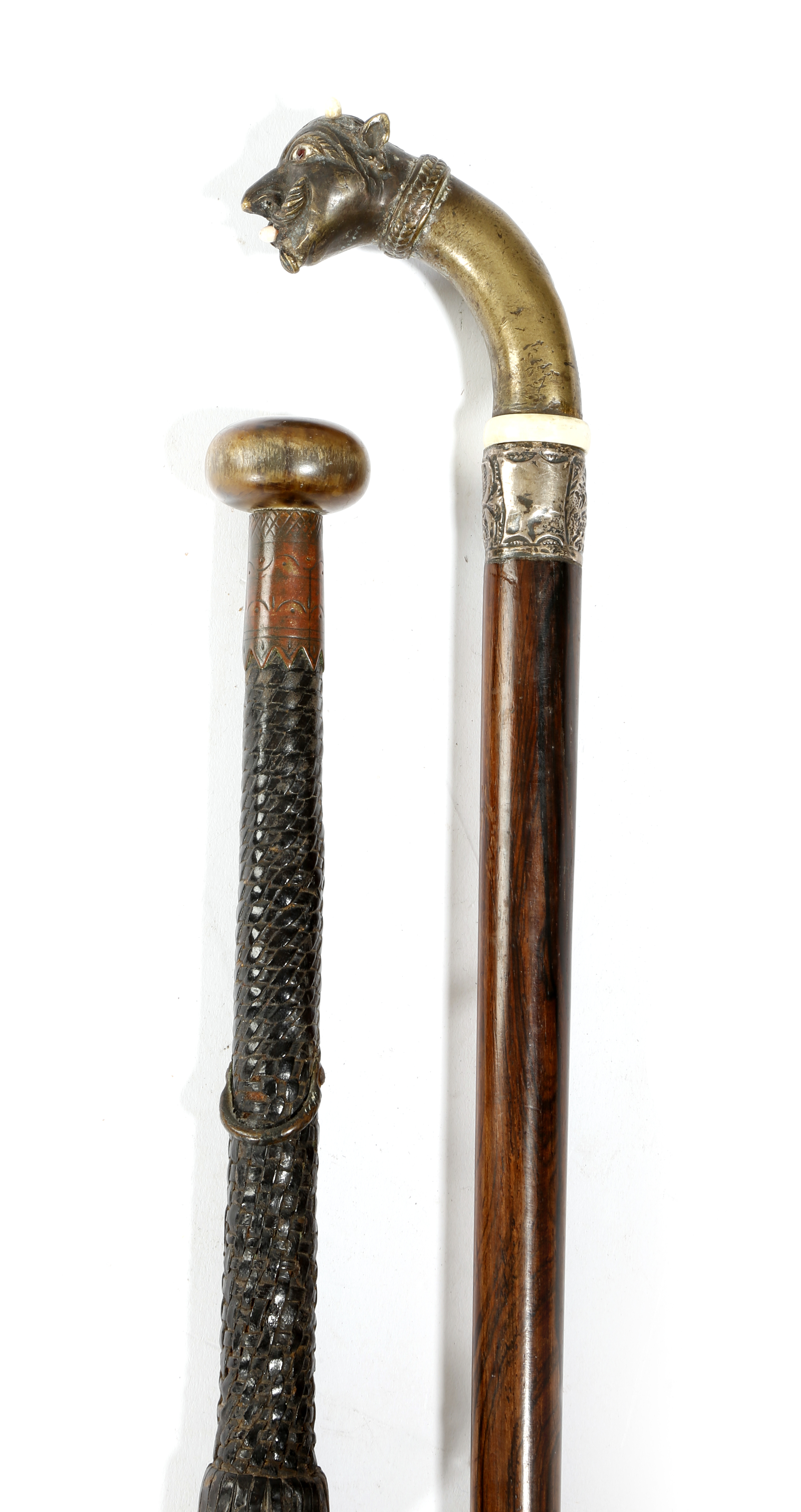 λ A George V 'system' vesta walking cane, the brass handle in the form of a devil's head with ivory horns and collar, which unscrews to reveal a compartment for matchsticks, the back of the handle with a strike, with a silver ferrule hallmarked for London 1911 and a rosewood shaft, together with a French Pyrenees Basque makhila walking cane, with a medlar shaft decorated with snakes, the pull-off horn and leather handle revealing a spike, the brass terminal inscribed 'AINCIART LARRESSORE 1915', 96.2cm long (max). (2)