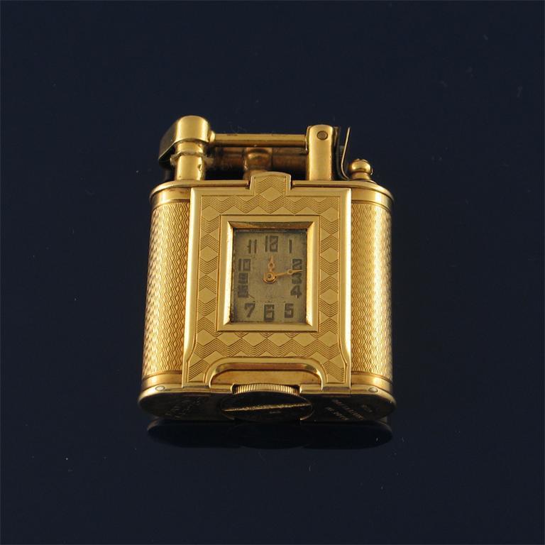 A Dunhill Unique 18ct. gold combination lighter and watch. Rectangular dial with arabic numerals. Case numbered 264, hinged fold down mount for access to movement. Engine-turned decoration overall. Import marks for 1926. 4.5 cm. high.