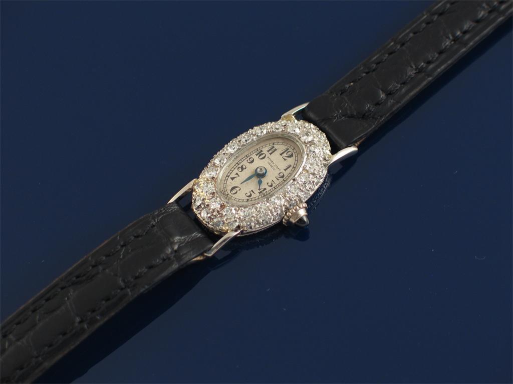 A ladies 18ct white gold diamond dress wristwatch, the dial signed Henry Capt. Diamond set bezel and cabochon and sapphire winder. Associated leather band. c.1940.
