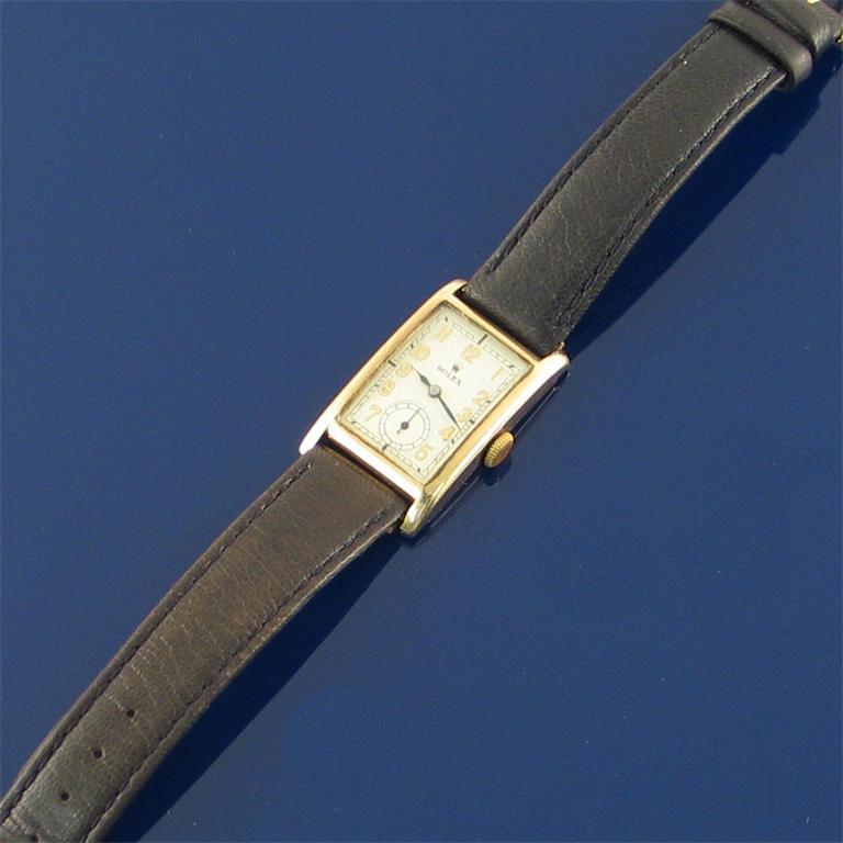 A 9ct gold rectangular wristwatch by Rolex, signed white dial and applied with gold arabic numerals and subsidiary sweep seconds dial. Associated black leather band.