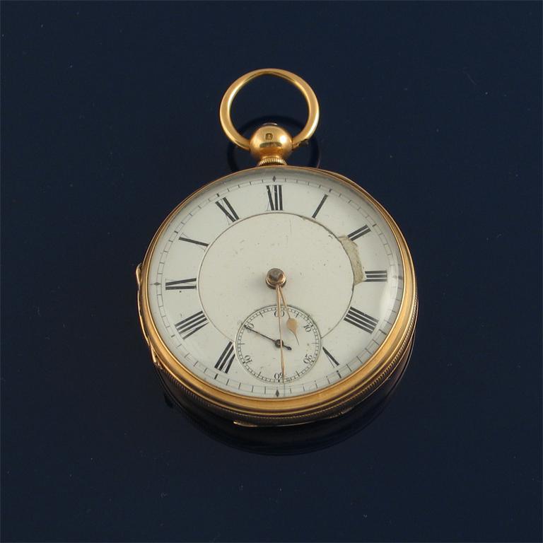 A Victorian open faced 18ct gold pocket watch, white enamel dial (damaged), with subsidiary seconds dial. The movement numbered 66233, the case hallmarked for Chester 1872.