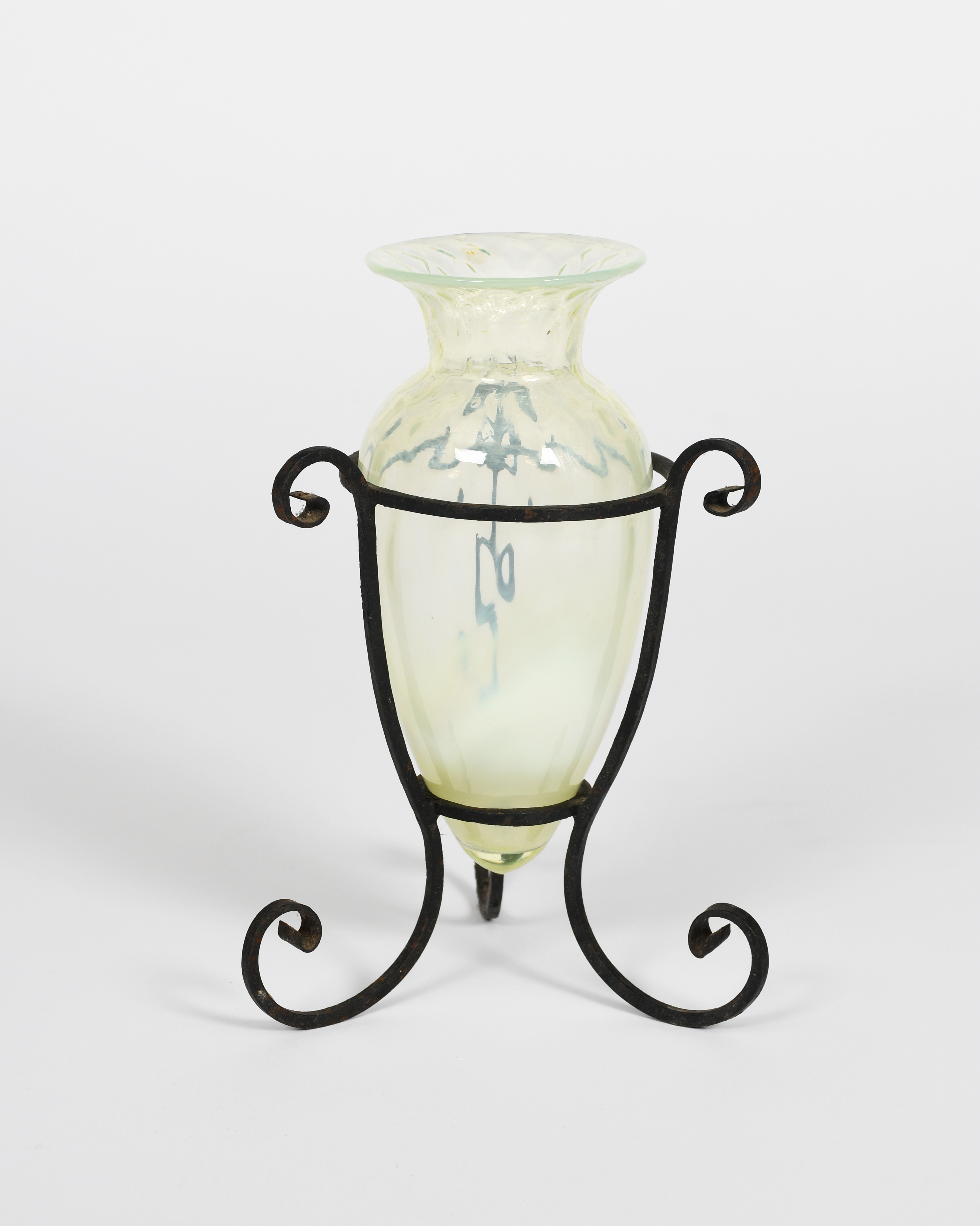 A small James Powell & Sons Whitefrairs glass vase in wrought iron mount designed by Harry Powell