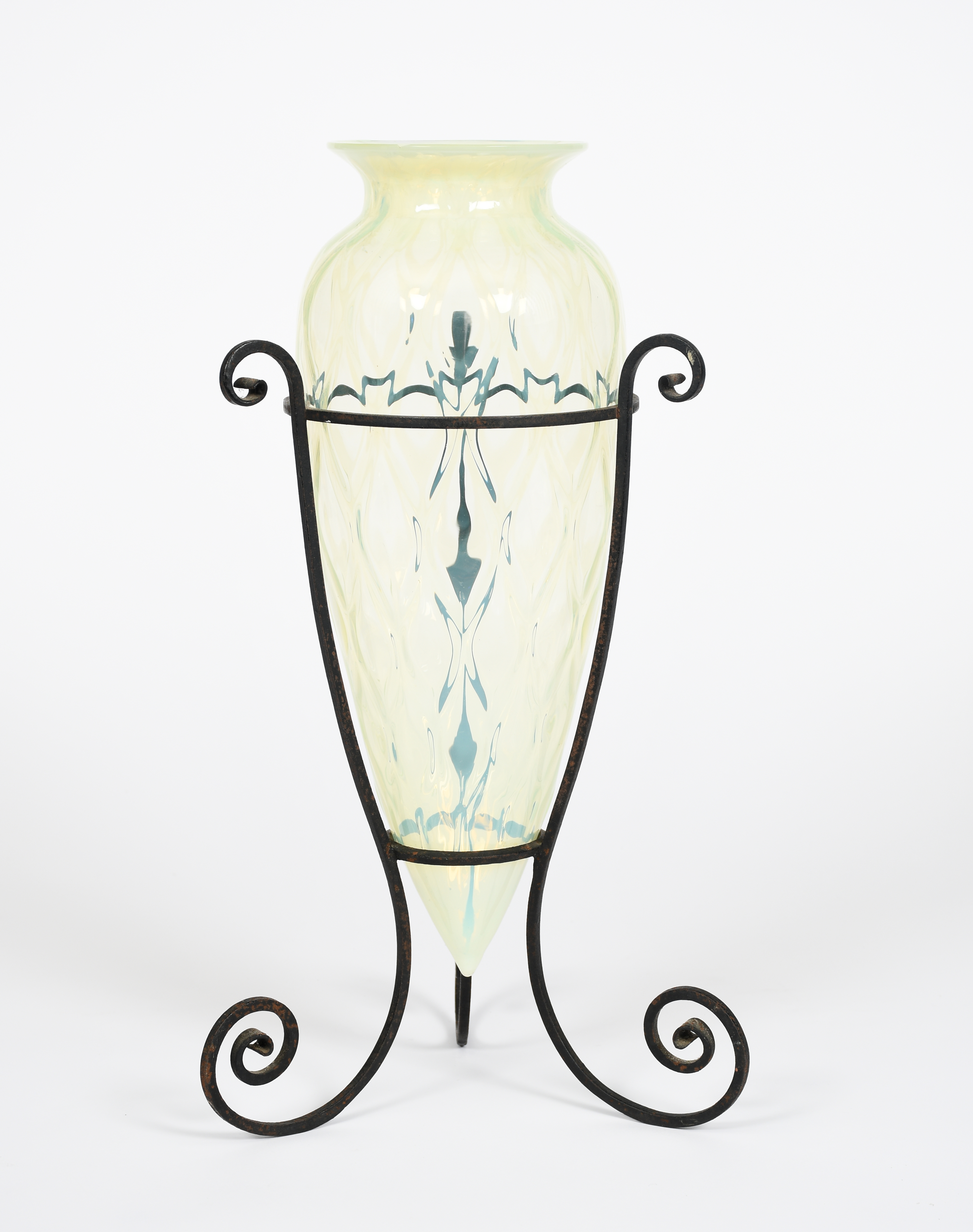A James Powell & Sons Whitefriars glass vase in wrought iron mount designed by Harry Powell, straw opal glass, in wrought iron mount, unsigned, 41cm. high