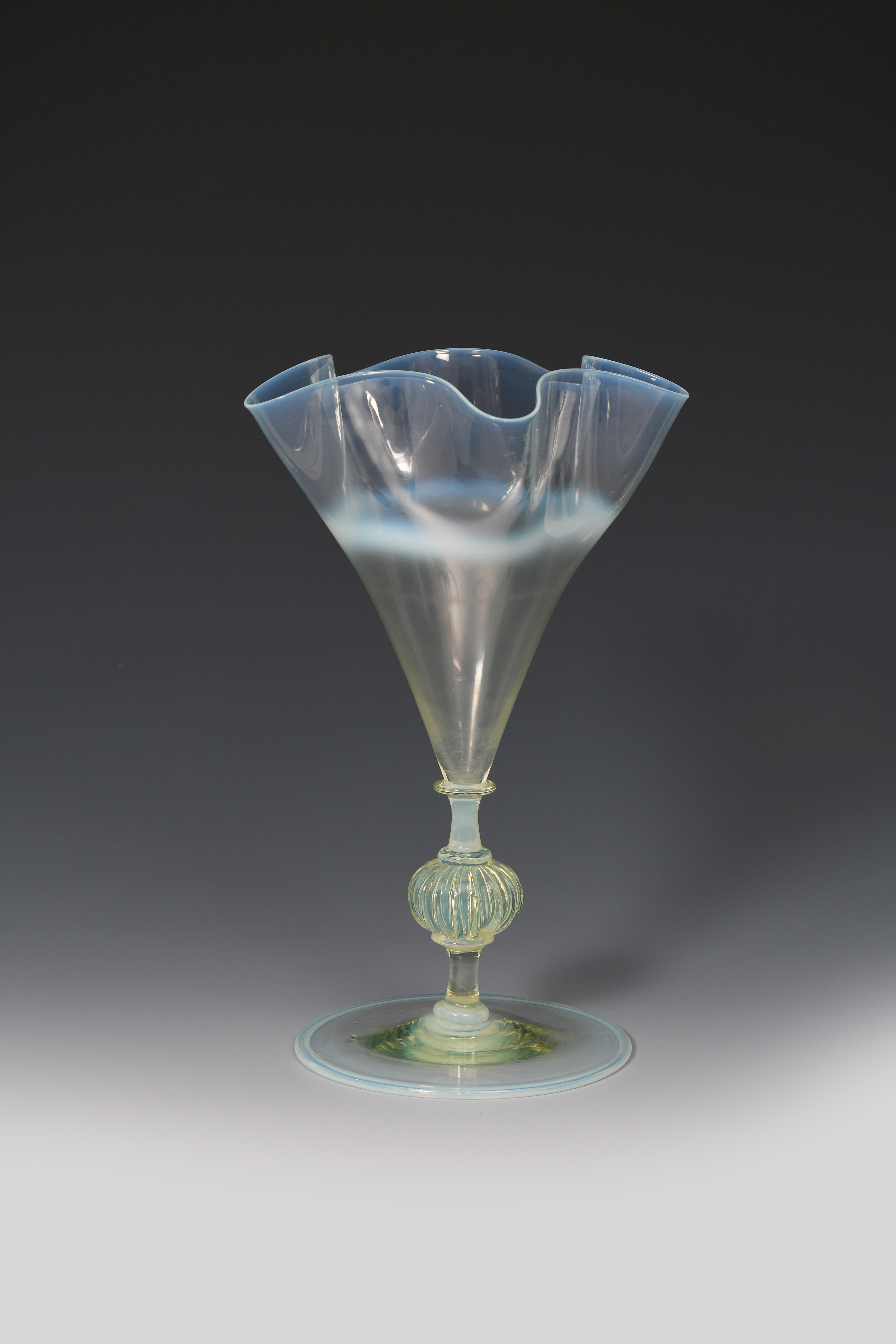 A James Powell & Sons Whitefriars opal glass goblet vase probably designed by Harry Powell, on slender knopped stem, with flaring fluted bowl, unsigned, 22cm. high